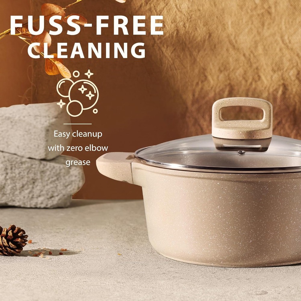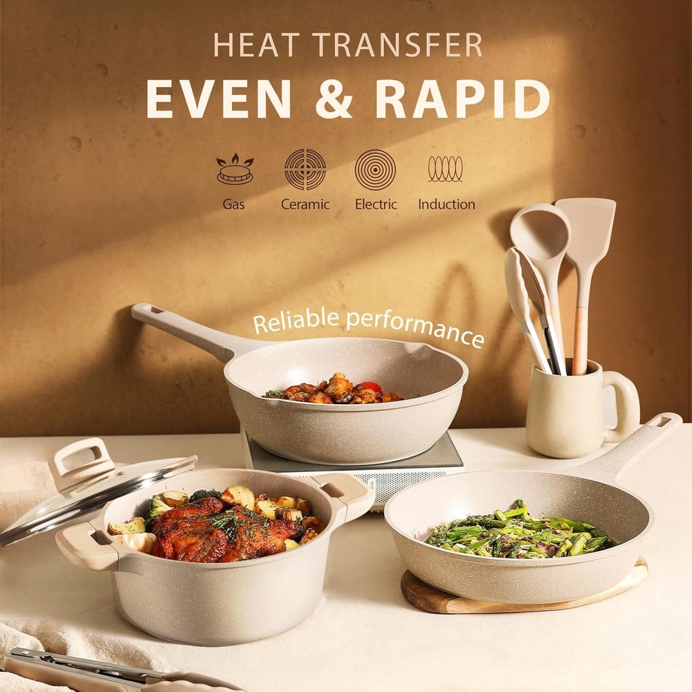 CAROTE 13pcs Kitchen Pots and Pans Set Non Stick, Taupe 13 Pieces, Product Details Material: Die Cast Aluminum Color: Taupe Brand: CAROTE Size: 13 Pieces Handle Material: Bakelite Is Dishwasher Safe: No Material Type Free: PFOA Free, PFOS Free Compatibility Options: All stoves compatible Number of Pieces: 13 Closure Material: Silicone Included Components: Lid Is Oven Safe: No With Lid: Yes Manufacturer: CAROTE Utensil Compatibility: Non-Metal Special Feature: Non Stick, All Stovetop Compatible, High cost-effective Package Dimensions: 15.63 x 12.76 x 7.72 inches Item Weight: 14.04 pounds Country of Origin: China Item model number: A10230 Everyday with High Quality Performance: This 13pcs meets all your requirements in kitchen, includes 6''/9'' frying pan, 1.6qt Sauce pan with lid, eggpan, 4.5qt Casserole with lid, 3qt Saute Pan with lid and 4pcs pan protectors. Long-last with Die-cast Aluminum Performance: The reinforced die-cast aluminum construction of this kitchen pots and pans set make it resistant to wear and tear, allowing it to withstand frequent usage without compromising its performance. Cook Without Worries:Our cookware sets are free of PFOA, PFOS. You can enjoy your cooking on carote cookware safely & easily. Fuss-Free Cleaning: Clean it just one wipe! Enjoy effortless cooking and cleaning with ultra-nonstick surface. Rapid & Even Heating: Die-cast aluminum body makes it with fast heat distribution so the same temperature everywhere on the pan while boiling, braising, simmering, reheating. Kindly note that we recommend not to use the smallest pan on induction for a better cooking experience.