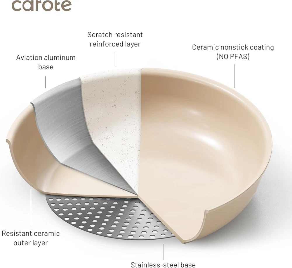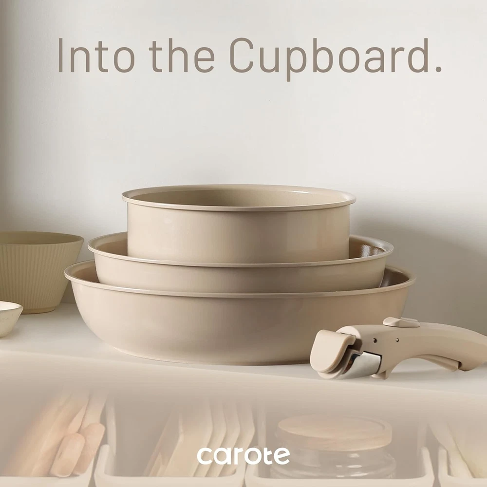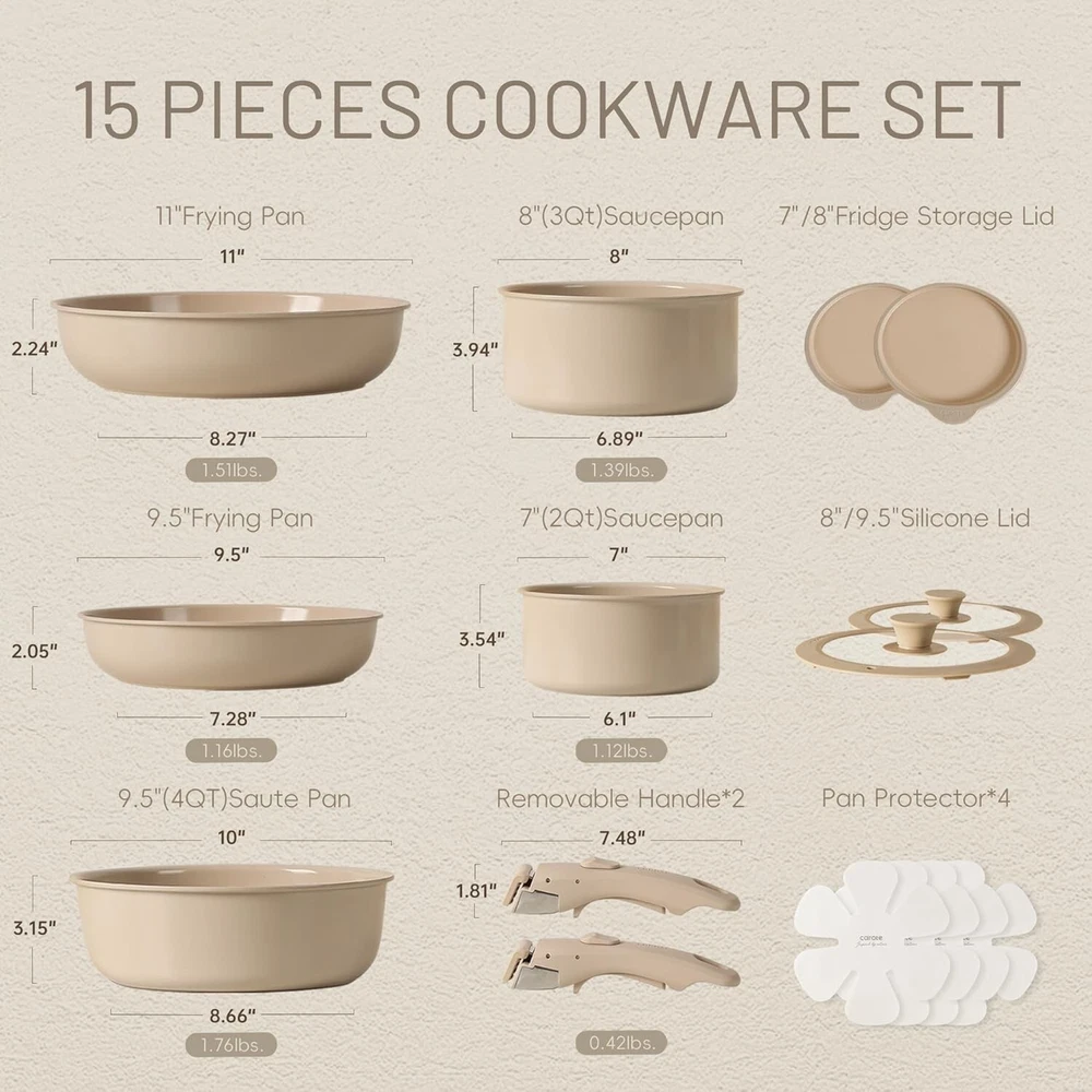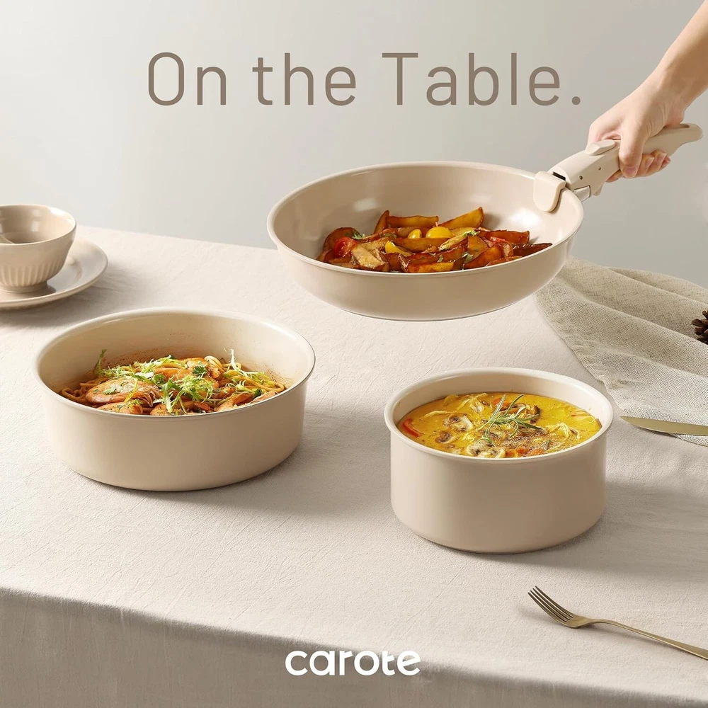 Storage Hack: Optimal storage and easy stacking with the handles off saves up to 70% more space of Carote detachable handle pots and pans set. Dishwasher Safe: Cleanup with 0 elbow grease thanks to the ceramic nonstick granite, safe to use in the dishwasher. Save Money on Baking Pan: Go from ALL kinds of hobs to the oven in a click, with a removable handle for the ultimate versatility. Rapid and even heating. Save Money on Dinnerware Set: Balanced convenience-rich features, it can be used as a dinner wares set to all your memorable moments. Save Money on Storage Container: With storage lid, this removable cookware set can serve as a storage container in the fridge. Set Includes: 11''/9.5'' skillet, 9.5'' sauce pan, 8''/7'' sauce pan, 8''/9.5'' silicone lid, 8''/7''storage lid, 2*handles, 4*pan protectors.