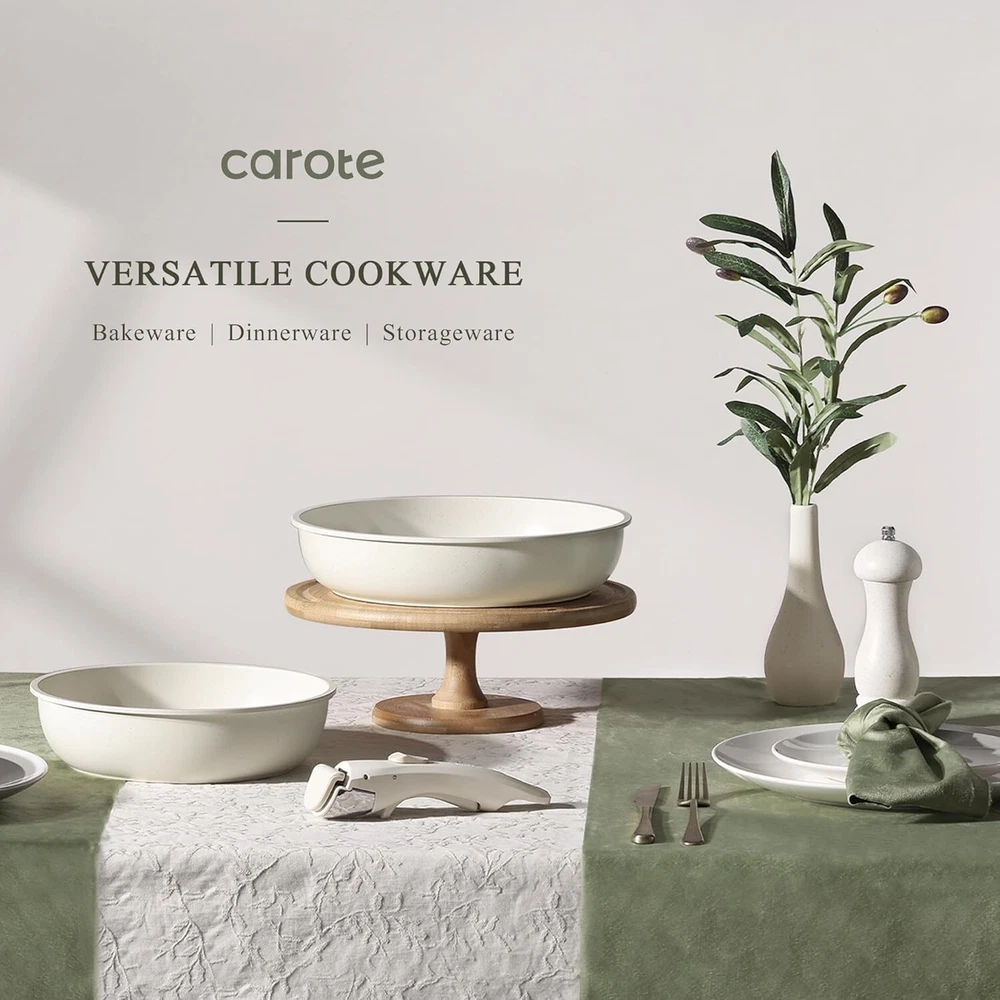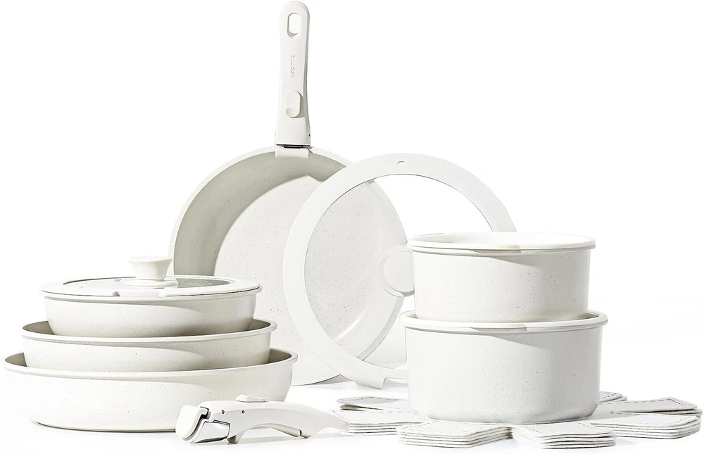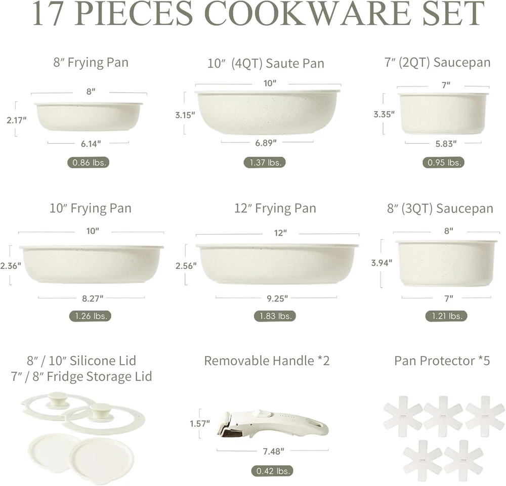For a Clutter-free Cupboard: Optimal storage and easy stacking with the handles off saves space of detachable handle pots and pans set. For a Fuss-free Cleaning: As both a cookware set and a dinnerware set, 1-time cleaning for all. Cleanup with ZERO elbow grease thanks to the nonstick gra nite. Multitasking Cookware Set: Removable handle for the ultimate versatility– go from ALL kinds of hobs to the oven, to the grill, to the fridge, and onto the table in a click. You won't Compromise on Quality: Balanced convenience-rich features, rapid and even heat transfer, and nonstick performance as the same as other Carote cookware sets. Set Includes: 12''/10''/8'' skillets, 10'' sauce pan, 3qt/2qt sauce pan, 10''/8'' silicone lid, 8''/7'' storage lid, 2*detachable handles, 5*pan protectors.