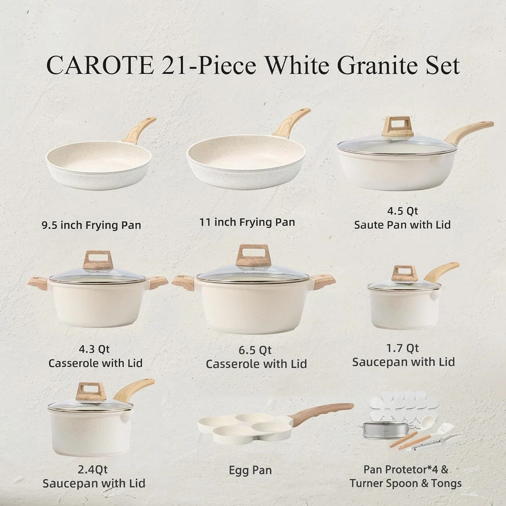 Sturdy Die-Cast Aluminum Body: The reinforced die-cast aluminum construction of this kitchen pots and pans set ensures long-term durability and reliability while maintaining a lightweight design. This lightweight feature brings convenience to your cooking experience. CAROTE 21-Piece Cookware Set Includes Egg pan, 9.5 inch Frying Pan, 11 inch Frying Pan, 1.7 QT Saucepan with Lid and steamer, 2.4 QT Saucepan with Lid, 4.3QT Casserole Pot with Lid, 6.5QT Casserole Pot with Lid, 4.5QT Saute Pan with Lid, *3 Utensils,4*Pan Protector. Our favourite non-stick pots and pans set meets all your needs for everyday cooking. White Granite – A top-level, harder nonstick granite material with 10x Ultra Non-stick performance, PFOS/PFOA free, our cookware ensures your daily cooking is always safer and healthier. Easy To Clean – Just wipe it with a paper towel or rinse it with water, Less CO2 emission and Less water wasted. Recommend hand washing the cookware as it is effortless to clean. Suitable For All Stoves – Heats up quickly and evenly with an extended bottom design. A high magnetic conductive stainless steel base allows our nonstick cookware to work on all cooktops, including induction. Service & Guarantee – Each CAROTE cookware passes a strict multi-inspection process. In case you received defective items caused by delivery, please don't hesitate to reach out, You will be guaranteed to get a refund or a new replacement.