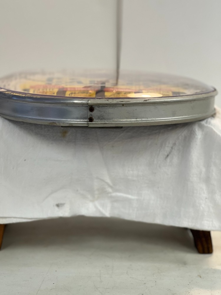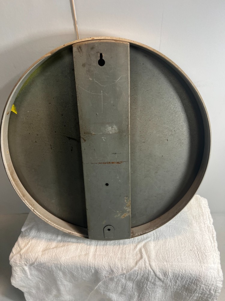 A VINTAGE CASITE OIL CO 12" ROUND WALL THERMOMETER.WORKS GOOD. THE COVER OVER THE THERMOMETER IS CONVEX ACRYLIC PLASTIC AND IS A REPLACEMENT. PLEASE REVIEW THE PICTURES BEFORE PURCHASING. I DO NOT ACCEPT RETURNS. THANKS FOR LOOKING.