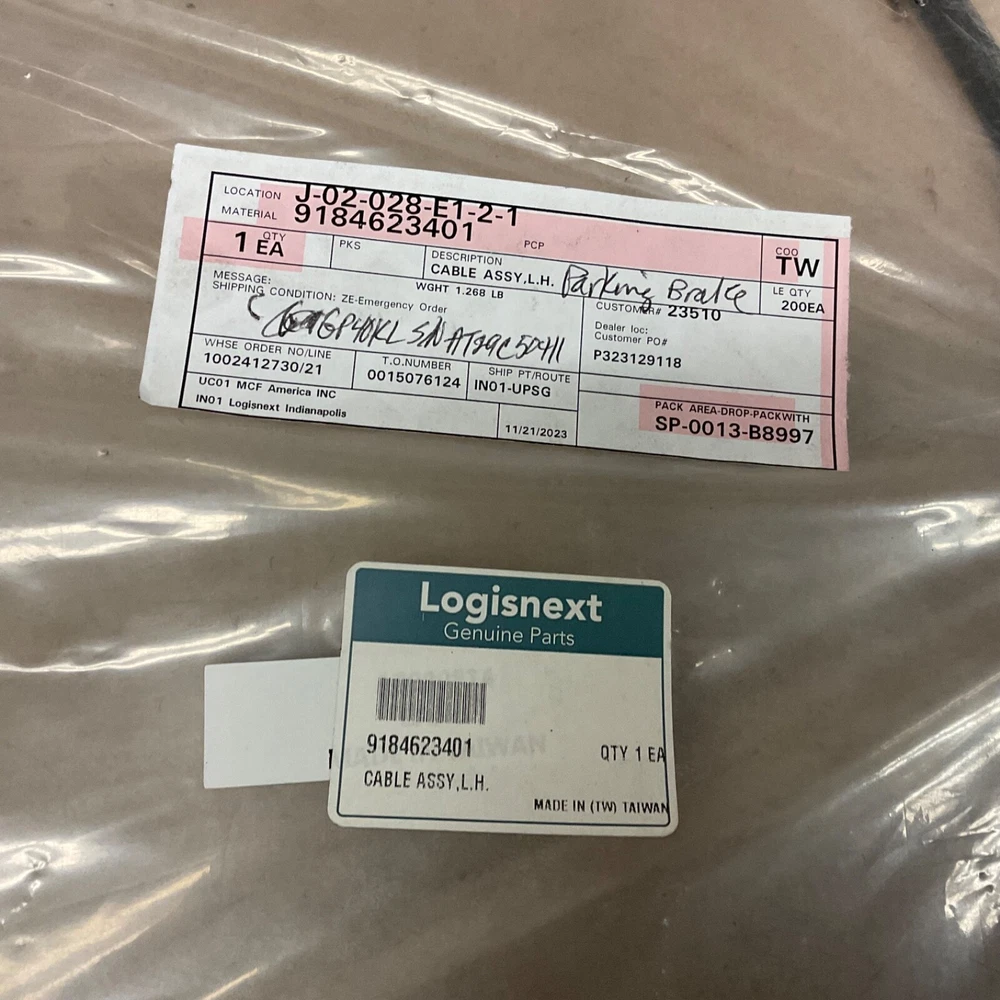 CATERPILLAR / MITSUBISHI PARKING BRAKE CABLE ASSEMBLY PART # 9184623401 THIS PART APPEARS BRAND NEW, IN ORIGINAL SEALED BAG WITH PARTS TAG. IT CAME WITH A LOT OF FORKLIFT PARTS I AM SELLING FOR A LOCAL TECHNICIAN. ABOUT 4 1/2’ LONG, SEE PICTURES OF THE ENDS. POSSIBLY FOR GP40K AND MAYBE OTHER MODELS? FREE SHIPPING. PLEASE VERIFY WITH YOUR DEALER TO MAKE SURE THEY WILL FIT YOUR MACHINE. CHECK OUT THE "FORKLIFT PARTS" SECTION OF MY STORE FOR MORE NEW AND USED PARTS. I WILL COMBINE SHIPPING IF YOU BUY MULTIPLE ITEMS. I WILL COMBINE SHIPPING IF YOU BUY MULTIPLE ITEMS PLEASE CHECK OUT MY OTHER ITEMS, THANKS FOR LOOKING.