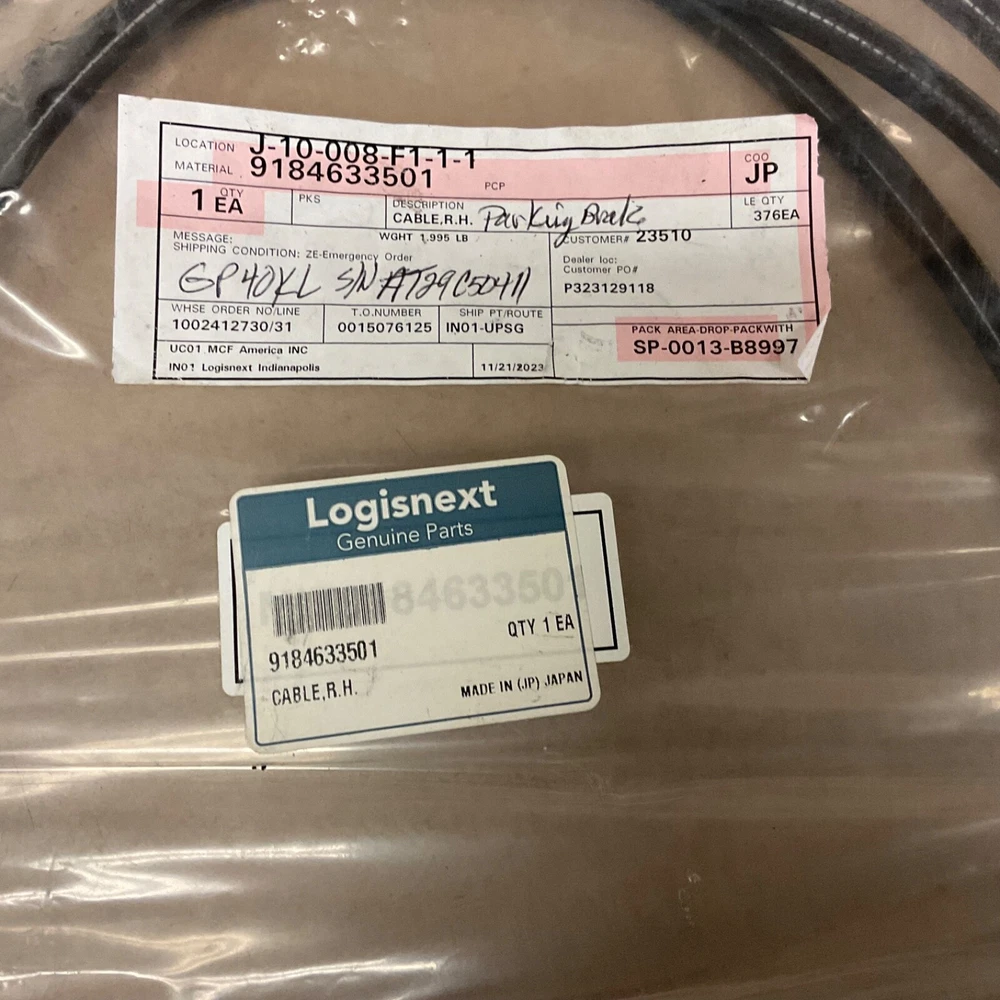 CATERPILLAR / MITSUBISHI PARKING BRAKE CABLE ASSEMBLY PART # 9184633501 THIS PART APPEARS BRAND NEW, IN ORIGINAL SEALED BAG WITH PARTS TAG. IT CAME WITH A LOT OF FORKLIFT PARTS I AM SELLING FOR A LOCAL TECHNICIAN. ABOUT 8’ LONG, SEE PICTURES OF THE ENDS. POSSIBLY FOR GP40K AND MAYBE OTHER MODELS? FREE SHIPPING. PLEASE VERIFY WITH YOUR DEALER TO MAKE SURE THEY WILL FIT YOUR MACHINE. CHECK OUT THE "FORKLIFT PARTS" SECTION OF MY STORE FOR MORE NEW AND USED PARTS. I WILL COMBINE SHIPPING IF YOU BUY MULTIPLE ITEMS. I WILL COMBINE SHIPPING IF YOU BUY MULTIPLE ITEMS PLEASE CHECK OUT MY OTHER ITEMS, THANKS FOR LOOKING.