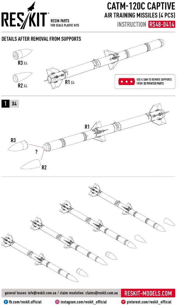 CATM-120C Captive air training missiles (4 pcs) (F-15, F-16, F-18,F-22, JAS-39, Eurofighter) (3D Printed) ResKit RS48-0414 - for Plastic Model Kit Enhance Your Scale Models with ResKit | High-Quality Resin & 3D-Printed Accessories RESKIT - Accessories for Scale Plastic Kits Upgrade your scale model collection with high-quality resin parts from ResKit. Our Ukrainian-made parts are meticulously crafted to provide the most accurate and detailed representation of original components. Whether you're building aircraft, helicopters, military vehicles, or figures, ResKit has the perfect parts to enhance your project. Scale: 1/48 Manufacturer: RESKIT (Accessories for Scale Plastic Kits) Country/Region of Manufacture : Ukraine Condition : New in Box Category: Resin & 3D accessories Type of equipment : Aircraft Type of product: Arms and weapons Recommended kit: Any CATM-120C Captive air training missiles (4 pcs) for aircraft model kit: F-15 F-16 F-18 F-22 JAS-39 Eurofighter ResKit is a Ukrainian manufacturer of high-quality resin parts and accessories for scale models . The products are distinguished by a high level of detail and accuracy, which allows modelers to create the most realistic models of military equipment, aviation and other objects. Key Features: Premium Quality: Our resin parts are made with the finest materials and precision engineering. Extreme Detail: Experience unparalleled detail and realism in your models. Wide Range: Choose from a vast selection of parts for various scales and subjects. Easy to Assemble: Our parts are designed for easy integration into your existing model kits. Superior quality! ResKit parts allow you to create a model with incredible detail. ---------------------------- >>> Visit our eBay store! <<< You will find everything you need at great prices. Scale model accessories are a wide range of parts, spares, and components that can help you make your model even more realistic and detailed. In our catalog, you will find everything you need to assemble and repair model cars, airplanes, ships, tanks, and weapons. Our accessories are made from high-quality materials and meet all standards. We offer a wide range of models and sizes so you can find what you need. Buy scale model accessories in our store and make your model even more unique!