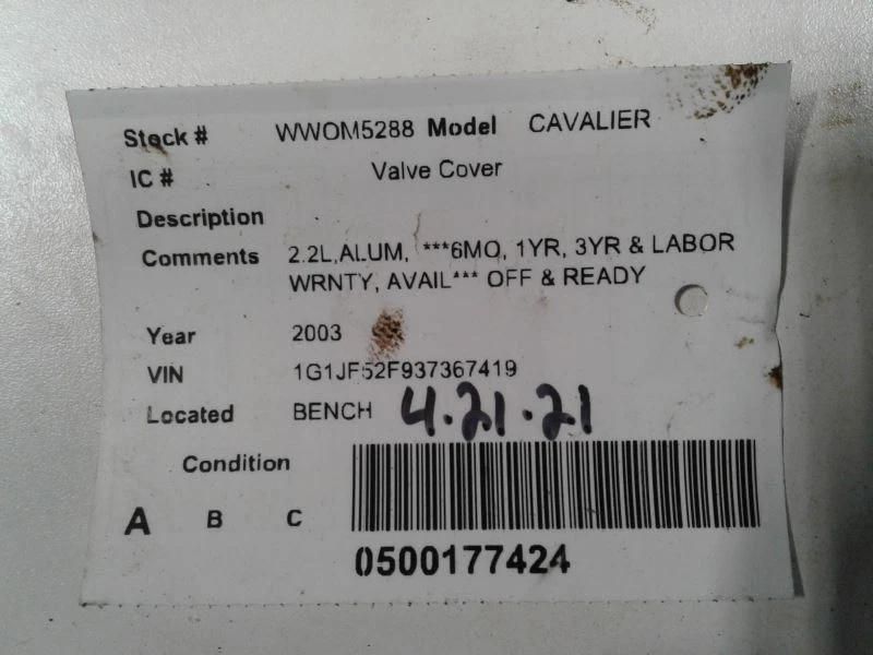 Powered by Frooition All Items See our eBay store for more great items >> Shop Categories ABS Anti-Lock Brake Part Other Aftermarket Stereos Air Bags Amplifiers Anti-Lock Brake Part Automobiles Stereos A/V Equipment CD Changers Center Caps + Wheel Covers Chassis Brain Box Coil Packs Computer + Control Modules Distributors Door Mirrors Door Panels DVD Equipment Engines Front Lamps Grilles Headlamp & Front Lamps Heat A/C Control Heater Motor/Blower Starters Interior Switches Interior Switch / Controls Keyless Entry FOB Owners Manual's Speedometers Tail Lights Transmission Wheels + Tires Alternators Fuel Pumps Window Regulators & Controls Steering Pumps Wiper Motors Compressors INFO/GPS/TV SCREENS Radiator Windshield Washer Bottles Condenser Shifters Windows & Sunroof Turbo Superchargers Glass Doors Air Cleaner Box Spindles Drive Shafts CAVALIER 2003 Valve Cover 579615 Item Description This listing is for the item pictured. It is ready to ship and comes with a 90 day warranty! eBay compatibility may be incorrect. See below for fitment information and any notes pertaining to this specific part. Feel free to contact us if you have any questions. Thanks for looking! Donor Vehicle: Year: 2003 Model: CAVALIER Stock #: OM5288 Mileage: 28000 Notes: 2.2L,ALUM, 6MO, 1YR, 3YR LABOR This part will only fit: For more parts from this vehicle, CLICK HERE . About Us About Us Payment Shipping Terms Returns About Us We are a family-owned business with over 30 years in the used car parts industry. We're proud to provide excellent quality used auto parts at famously discounted prices! Over time we have grown to 4 locations in Harrison, MI, Lansing, MI, Saint Johns, MI, and Toledo, OH. We are here to serve you Monday thru Friday 8 a.m. to 5 p.m. EST. If you have any concerns or questions, please feel free to message us here on eBay. We will normally get back to you within 12 hours during the work week. Payment Payment We accept Paypal, all major credit cards and cash (if you are picking up the item). Payment is required within 2 days of winning a listing. If payment is not made after 2 days, an unpaid item case will be opened. Shipping Shipping Most items will ship ground with UPS or USPS. We may use other carriers at our discretion. In some instances, freight orders will require a business address with a loading dock or forklift. A good working phone number is required for all orders. Local pickup is also an option on any order. Our 4 locations are open Monday thru Friday from 8 a.m. to 5 p.m. EST. Please check with us before driving out to make sure we have the part ready at the location nearest to you. Terms Terms Most items include a 90-day warranty (unless otherwise indicated). This coverage is included on all new or used parts unless otherwise stated in the listing or on the front of the invoice. This warranty is non-transferable. Labor is not covered under any circumstance unless a separate labor warranty is purchased. Extended warranties are also available. Please see our website for complete details and exclusions. Returns Returns We allow 60 days for returns. If you ordered the incorrect part or simply do not need it, you are responsible for the origin and return shipping. Helpful Links Add to Favorite Sellers Sign up to Newsletter View Feedback Contact Seller Visit seller's eBay Shop About Seller Page More Items! View more great items Anti-Lock Brake Part Pump Fits 98 EXPLORER 629993 $74.99 Driver Side View Mirror Power Sedan Heated Fits 04-09 SPECTRA 1813671 $99.99 Driver Side View Mirror Moulded In Black Power Fits 16-17 PATRIOT 1794572 $94.99 Passenger Right Headlight Dark Background Fits 05-07 MAGNUM 1440849 $74.99 Powered by Frooition Frooition | No-js Template | eBay design, eBay store design, eBay shop design, eBay template design, eBay listing design (ver:froo_no_js) This listing is currently undergoing maintenance, we apologise for any inconvenience caused.