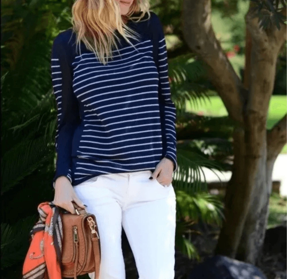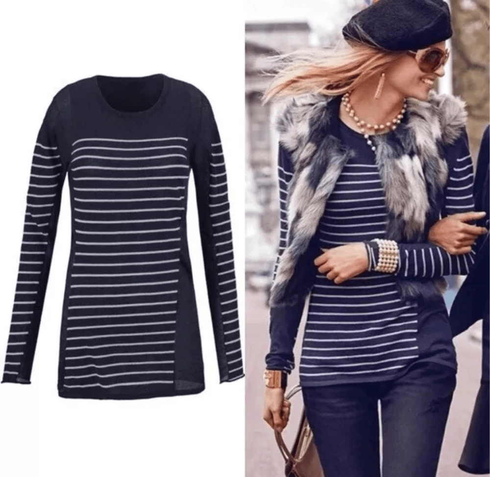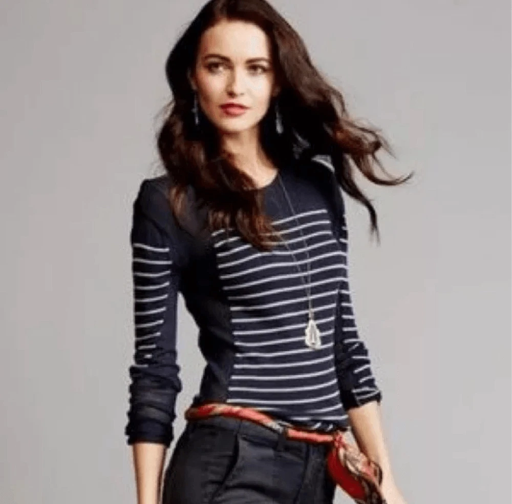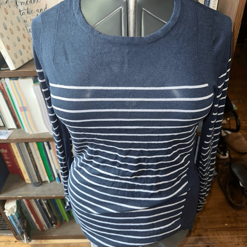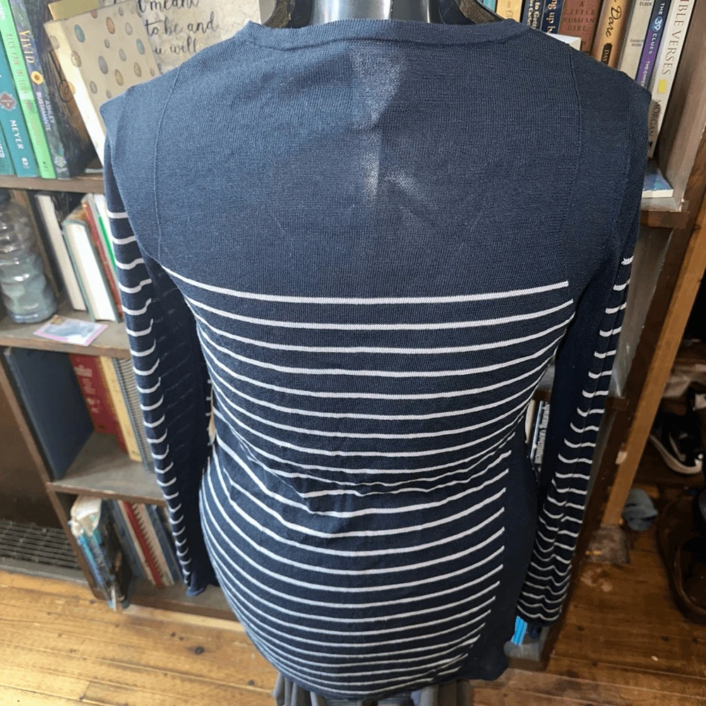 CAbi Regiment, navy and white, striped, nautical, lightweight, romantic, minimalist, elevated basics sweater . Pairs well with a jeans or slacks. Approximately 19 inches from armpit to armpit, 28 inches long. In good, used condition. From a pet and smoke free house.