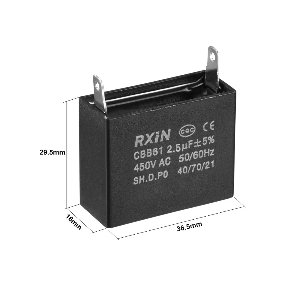 Document Specifications:Model: CBB61Material: Polypropylene FilmRated Voltage: 450V ACRated Capacity: 2.5uFTolerance:±5%Rated Frequency:50/60HzLead End: Single InsertSize: 36.5*16*29.5mmClimatic Category: 40/70/21Operating Temperature Range: 40/70/21 Features:This CBB61 run capacitor is with a small loss,anti-moist,excellent electrical performance,reliability,long life.Professional capacitors for ceiling fan, wall fan, stand fan , small single phase motors and long life time.Low loss at high frequency, small inherent temperature rise. Package Includes:1 X 450V AC 2.5uF Capacitors CBB60 Run Capacitor 8uF 450V AC Double Insert 69x32mm White for Pump Motor USD 8.47 CBB60 Run Capacitor 35uF 450V AC 2 Wires 96x45mm with M8 Fixing Stud, Terminal USD 15.41 Metallized Film Ceiling Fan Capacitor CBB61 5.5uF 250V AC 2 Wires USD 7.25 Metallized Film Ceiling Fan Capacitor CBB61 10uF 250V AC 2 Wires 3Pcs USD 13.23 70uf Motor Run Capacitor 70mfd AC 450V for Air Conditioner or Heat Pump USD 24.46 2 Terminal CBB61 Ceiling Fan Capacitor 1uF 450V AC Start Run Capacitors 6pcs USD 11.37 CBB61 450V AC 2.5uF Single Air Conditioner Parts Fan Motor Start Capacitor Specifications: Model: CBB61 Material: Polypropylene Film Rated Voltage: 450V AC Rated Capacity: 2.5uF Tolerance:±5% Rated Frequency:50/60Hz Lead End: Single Insert Size: 36.5*16*29.5mm Climatic Category: 40/70/21 Operating Temperature Range: 40/70/21 Features: This CBB61 run capacitor is with a small loss,anti-moist,excellent electrical performance,reliability,long life. Professional capacitors for ceiling fan, wall fan, stand fan , small single phase motors and long life time. Low loss at high frequency, small inherent temperature rise. Package Includes: 1 X 450V AC 2.5uF Capacitors Hot Item CBB21 Metallized Polypropylene Film Capacitors 400V 0.15uF 10 pcs USD 6.97 Metallized Film Ceiling Fan Capacitor CBB61 4.75uF 350V AC 2 Wires USD 7.36 100 Pieces 8 Value 0.22uF-470uF Electrolytic Capacitors Assortment Kit Set USD 6.59 3KV 1nf High Voltage Ceramic Doorknob Capacitor New USD 8.36 CBB61 Run Capacitor 450V AC 0.8uF Metallized Polypropylene Film Capacitors Black USD 6.83 Payment We accept eBay payment. Please do not email us to ask for other payment option. We appreciate prompt payment and look forward to your business in the future. Unpaid item will be filed without receiving payment in 7 days from listing ended. Shipping Usually we ship your order out within 24 hours in business day. For shipping and handling charges (S&H) for specific item, please refer to the item listing page for more details. Please make sure your shipping address is correct. We are not responsible for any loss in transit if a wrong address is provided. Return Policy Returns for exchange are permitted and must be initiated by the buyer within 30 days upon receipt. If you would like to return your product(s) for repair / replacement / refund, please kindly contact our customer service representatives via email for an authorized RMA number. Your returned product(s) will not be processed without a completed RMA. About Us We are continually expanding our product selection to better serve your need. We look forward to providing the best sevice to you - our dear customers, so take a look around our store and find the product that you want. You can put your trust in us! If you need any help or have any suggestions, please don't hesititate to contact us anytime , we will reply you within 24 hours and try the best to help you. Description Policy CBB61 450V AC 2.5uF Single Air Conditioner Parts Fan Motor Start Capacitor Specifications: Model: CBB61 Material: Polypropylene Film Rated Voltage: 450V AC Rated Capacity: 2.5uF Tolerance:±5% Rated Frequency:50/60Hz Lead End: Single Insert Size: 36.5*16*29.5mm Climatic Category: 40/70/21 Operating Temperature Range: 40/70/21 Features: This CBB61 run capacitor is with a small loss,anti-moist,excellent electrical performance,reliability,long life. Professional capacitors for ceiling fan, wall fan, stand fan , small single phase motors and long life time. Low loss at high frequency, small inherent temperature rise. Package Includes: 1 X 450V AC 2.5uF Capacitors CBB60 Run Capacitor 8uF 450V AC Double Insert 69x32mm White for Pump Motor USD 8.47 CBB60 Run Capacitor 35uF 450V AC 2 Wires 96x45mm with M8 Fixing Stud, Terminal USD 15.41 Metallized Film Ceiling Fan Capacitor CBB61 5.5uF 250V AC 2 Wires USD 7.25 Metallized Film Ceiling Fan Capacitor CBB61 10uF 250V AC 2 Wires 3Pcs USD 13.23 70uf Motor Run Capacitor 70mfd AC 450V for Air Conditioner or Heat Pump USD 24.46 2 Terminal CBB61 Ceiling Fan Capacitor 1uF 450V AC Start Run Capacitors 6pcs USD 11.37 Hot Item CBB21 Metallized Polypropylene Film Capacitors 400V 0.15uF 10 pcs USD 6.97 Metallized Film Ceiling Fan Capacitor CBB61 4.75uF 350V AC 2 Wires USD 7.36 100 Pieces 8 Value 0.22uF-470uF Electrolytic Capacitors Assortment Kit Set USD 6.59 3KV 1nf High Voltage Ceramic Doorknob Capacitor New USD 8.36 CBB61 Run Capacitor 450V AC 0.8uF Metallized Polypropylene Film Capacitors Black USD 6.83 Payment We accept eBay payment. Please do not email us to ask for other payment option. We appreciate prompt payment and look forward to your business in the future. Unpaid item will be filed without receiving payment in 7 days from listing ended. Shipping Usually we ship your order out within 24 hours in business day. For shipping and handling charges (S&H) for specific item, please refer to the item listing page for more details. Please make sure your shipping address is correct. We are not responsible for any loss in transit if a wrong address is provided. Return Policy Returns for exchange are permitted and must be initiated by the buyer within 30 days upon receipt. If you would like to return your product(s) for repair / replacement / refund, please kindly contact our customer service representatives via email for an authorized RMA number. Your returned product(s) will not be processed without a completed RMA