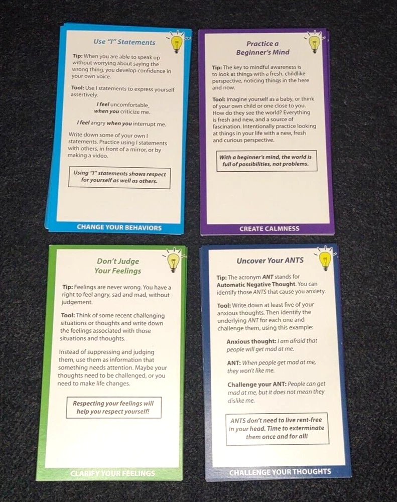 Relieve stress and calm anxiety with 55 quick and effective tips and tools. Each card features a short Tip, followed by a Tool, or short activity to put that Tip into practice. -Clarify Your Feelings -Challenge Your Thoughts -Change Your Behaviors -Calming Strategies
