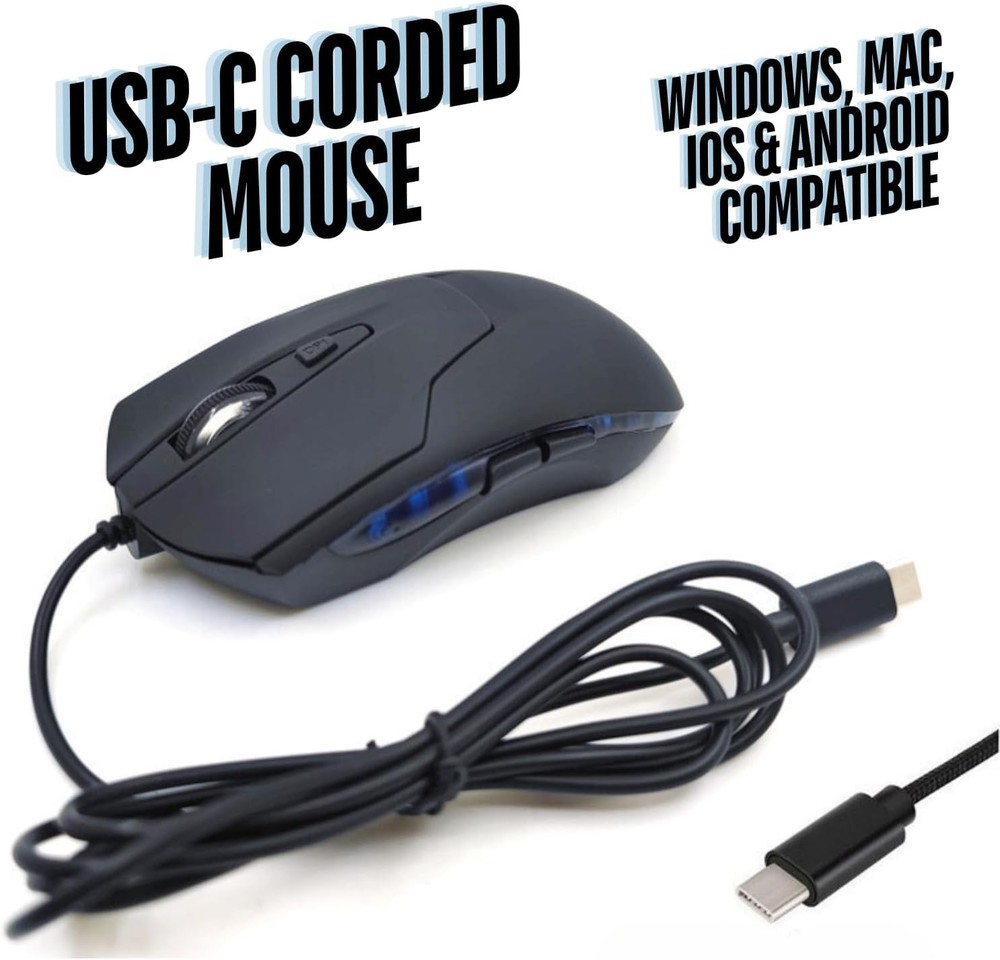 CBUS Wired USB C Mouse, 6-Button Quiet Click Computer Mouse - 4 DPI Black Product Details Product Dimensions: 4.7 x 2.5 x 0.04 inches Item Weight: 2.8 ounces Item model number: 202658 Manufacturer: CBUS Country of Origin: China Brand: Cbus Wireless Color: Black Connectivity Technology: USB Special Feature: Native USB-C Connector, 6-Buttons, 4-DPI Speed Switch, LED Backlight Movement Detection Technology: Optical Versatile Work & Gaming Companion: The CBUS Wired USB C Mouse is the ultimate accessory for your USB-C equipped latptop, desktop computer, smartphone, or tablet device. Lightweight and designed for both work and play, this mouse ensures seamless performance. The Quiet Click of the mouse is also a really nice feature. Effortless Connectivity: Experience easy setup with the CBUS USB-C mouse. Simply plug it into your USB-C port and start working or gaming without the need for dongles or batteries. This efficient design ensures a smooth and uninterrupted user experience. Precision Control: Enhance your productivity with the CBUS Wired USB C mouse’s precise red optical sensor and four adjustable DPI speeds (800, 1200, 1600, and 2400). Perfect for on-the-go tasks, this mouse allows you to switch DPI settings to match your accuracy needs instantly. Feature-Rich, Ergonomic Mouse: The 6-button design includes left and right keys, a scroll wheel, DPI switch, and dedicated webpage forward and backward keys, making it a versatile tool for navigating and multitasking efficiently. The ergonomic design ensures comfort during extended use, and the soft and steady blue LED light offer a nice and subtle visual effect. Broad Compatibility: Compatible with Macbook/Pro, iPad/Pro, HP, DELL XPS 13/14/15/16, Microsoft Surface/Pro/Book, Samsung Galaxy Book, Chromebook, Galaxy Tab tablets, and more. The CBUS Wired USB-C Gaming Mouse offers versatility across various platforms including Mac OS, iOS, Windows 10, Windows 11, and Chrome OS, It’s the ideal wired USB C mouse for mac and other devices, providing a reliable and high-performing usb type c mouse solution for all your computing needs. The CBUS Wired USB-C Mouse is the ultimate accessory for enhancing your productivity and gaming experience. Designed for seamless performance, this lightweight mouse features hassle-free connectivity, eliminating the need for dongles or batteries. Its precise red optical sensor with four adjustable DPI speeds (800, 1200, 1600, 2400) allows for on-the-fly precision, making it perfect for various tasks. The ergonomic design includes six buttons, such as left and right keys, a scroll wheel, DPI switch, and dedicated webpage navigation keys, ensuring efficient multitasking. Compatible with Mac OS, iOS, Windows 10, Windows 11, and Chrome OS, this versatile mouse is an ideal choice for MacBook, Chromebook, and other USB-C equipped devices, offering a high-performing USB-C mouse solution for all your computing needs.