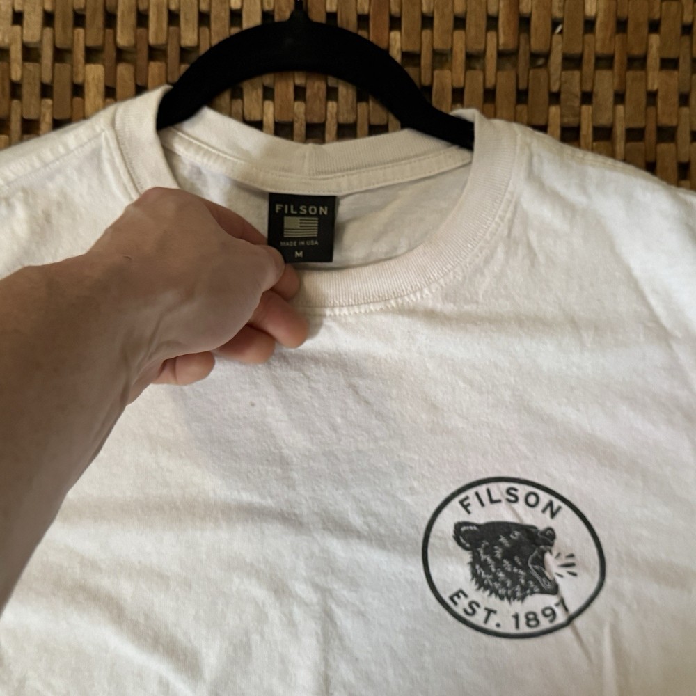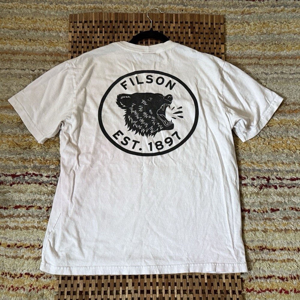 The CC Filson Grizzly Bear T-Shirt is a classic crew neck tee made from comfortable cotton material in a solid white color. It features a logo accent and is designed for regular fit, making it suitable for everyday wear. This men's shirt in size medium is machine washable and is proudly made in the United States by the renowned brand Filson, known for quality outdoor clothing.