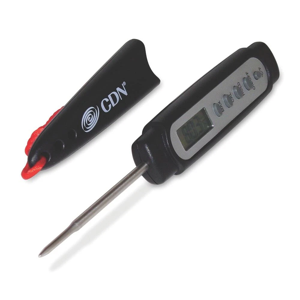 This CDN® thermometer is waterproof and shatterproof with big easy to read digits. It shuts off after 10 minutes and has a temperature guide on the sheath. Model: Q2450X Measurement Range: ‐40 to +450°F / ‐40 to +230°C 6 second response 1.5 mm thin tip 2.75" / 7.0 cm stem Waterproof and shatterproof For thin cuts of meat fish or poultry Data‐hold Big digit Food‐safe with BioCote® Stainless steel stem Field calibration On / off button Auto‐off after 10 minutes Temperature guide on sheath Sheath can be used as handle extension 2‐way mounting: pocket clip / rope 1.5V Button IEC LR44 Alkaline (included) "
