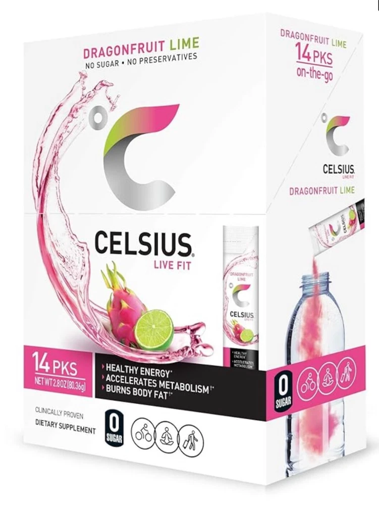 Main Purpose:Immune System SupportFlavor:Dragon fruit and cranbery limeIngredients:Dragon fruit lime and Cranberry limeSupply:N/AFormulation:PowderType:DrinkFeatures:All Natural, Green tea with EGCG, Ginger, & Guarana seedMPN:N/AActive Ingredients:Immune System SupportBrand:CelsiusWhen to Take:Before WorkoutNumber of Pills:28 Tubes
