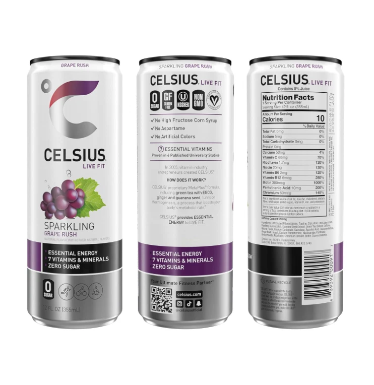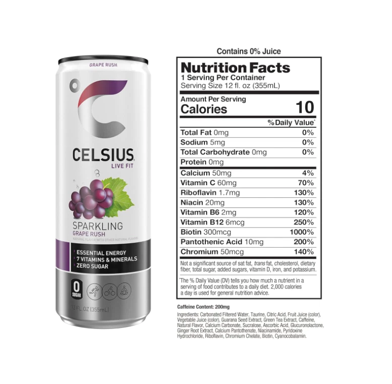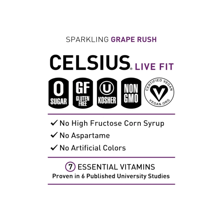 Functional, Essential Energy with 200mg Caffeine to help you LIVE FIT Made with Premium, Proven Ingredients and 7 Essential Vitamins No Sugar, No Sodium No High Fructose Corn Syrup, No Aspartame, No Artificial Flavors or Colors Gluten-Free, Kosher, Non-GMO, & Certified Vegan Juicy, sweet, refreshing and a little nostalgic. Enjoy the flavor packed taste of CELSIUS Sparkling Grape Rush.