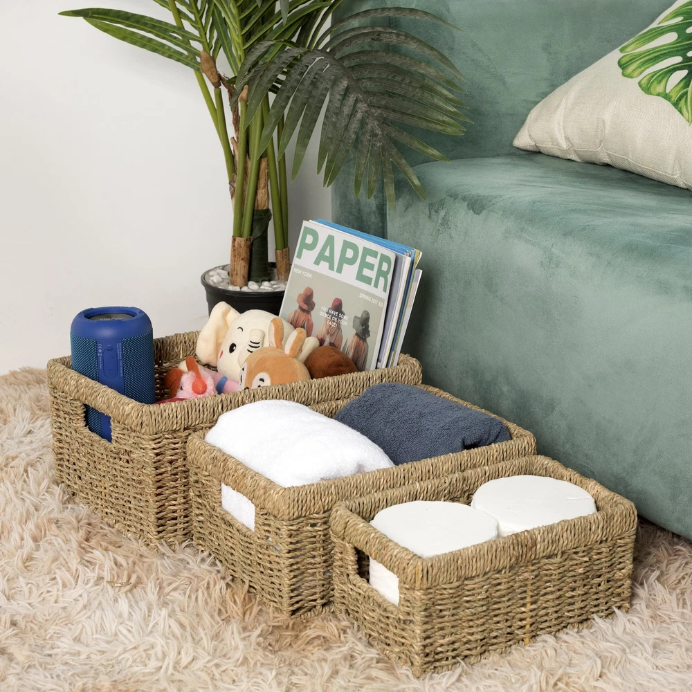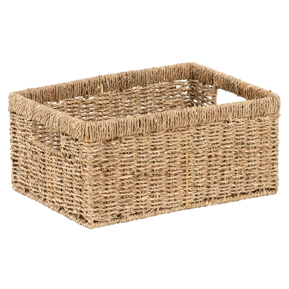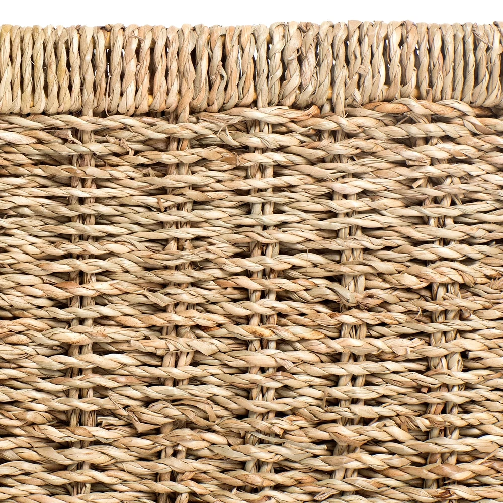 Large Basket 14 x 10 x 6.4 inches Woven by hand from natural seagrass over an iron frame in Vietnam Used as a storage basket for fruit, books, magazines, newspapers, games, pet toys, media, towels, clothes, toilet paper, or others Perfect for organization and storage with closets, shelves, racks, drawers, desks, pantries, bar counters, coffee tables, and more The basket is a great choice to decorate and organize your living space such as home, kitchen, office, restaurant, hotel, or garden Our open rectangle baskets are easy for organizing with insert handles. They can be used the same as containers, holders, trays, bins, or boxes anywhere in your home like in the living room, bedroom, bathroom, playroom, laundry room, and kitchen. Our weaving baskets are mainly handmade of all-natural and easily renewable materials like bamboo, rattan, wicker, straw, jute, seagrass, and water hyacinth with metal wire frames inside. We are proud to be the brand that has been supporting the local craftsmen and introducing their products to the world.