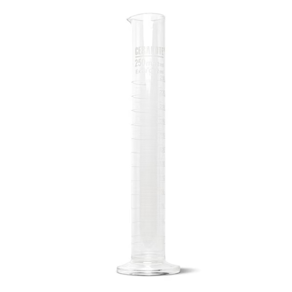 Cerakote Graduated Cylinders are used for mixing and measuring Cerakote coating. We offer these in 3 different sizes; 50, 100 and 250 ml. These graduate cylinders are made of glass, making them reusable and very easy to clean, and have easy-to-read milliliter measurements on the sides. The 50 and 100 ml cylinders are used for most Cerakote projects. The 250 ml version is great for those larger projects that require more coating than the Iwata LPH-80 spray gun cup can hold. The 250 ml can easily fit an entire Tester size bottle of Cerakote.