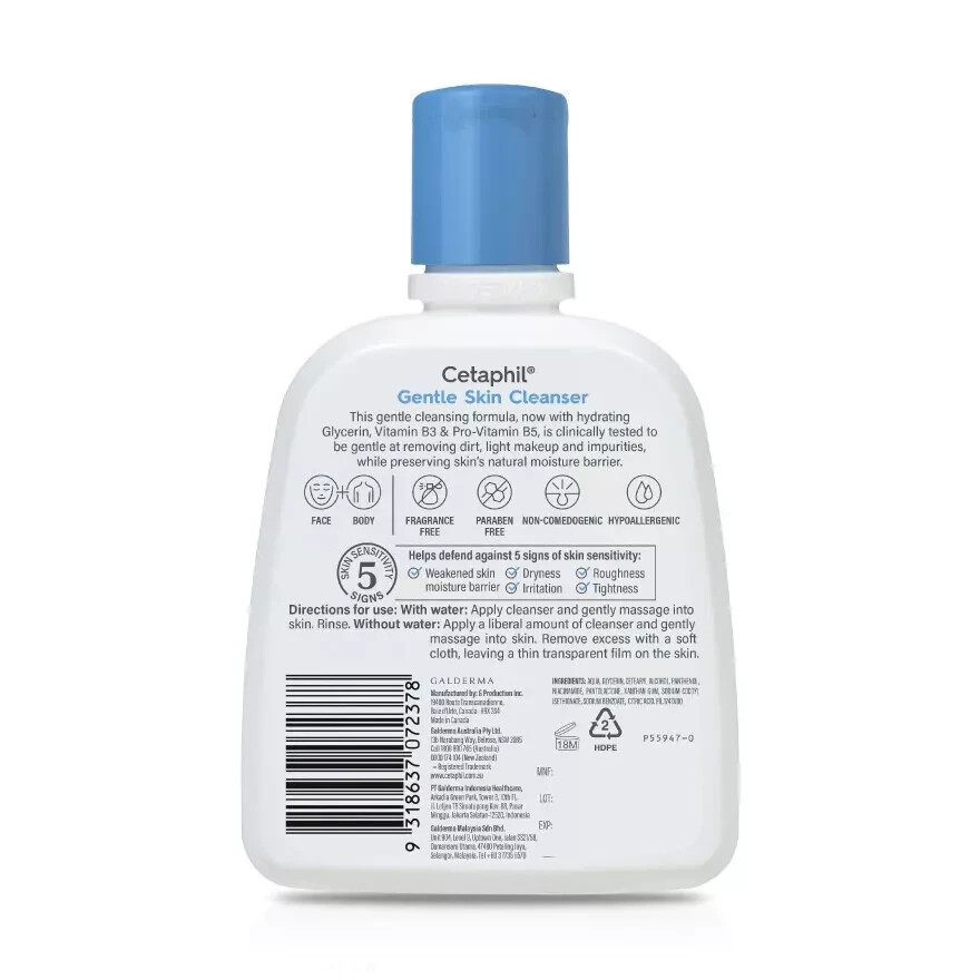 Product Details: Mild, non-irritating formula. Softens as it cleans. Every age. Every stage. Every day. This gentle, soap-free cleanser was originally formulated for dermatologists, specifically for everyday cleansing of even the most sensitive skin. Soothing, non-irritating, ideal for face and body. Helps skin retain needed moisture. Rinses easily and leaves skin feeling soft and smooth. Mild enough to cleanse a baby's delicate skin. Non-comedogenic.. Fragrance free. Dermatologist recommended. Made in Canada. Directions: Ways of using Cetaphil® Gentle Skin Cleanser: 1) For use without water: Apply a liberal amount of cleanser to the skin and rub gently. Remove excess with a soft cloth, leaving a thin film on the skin. 2)For use with water: Apply cleanser to the skin and rub gently. Rinse. After cleansing, your skin will feel moisturized and fresh due to increase in moisture content. Ingredients: Water, Cetyl Alcohol, Propylene Glycol, Sodium Lauryl Sulfate, Stearyl Alcohol, Methylparaben, Propylparaben, Butylparaben