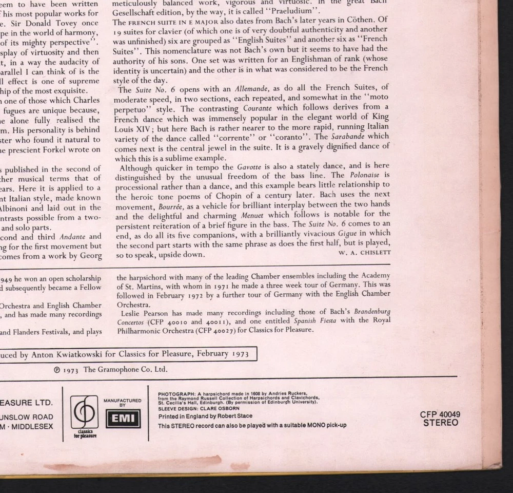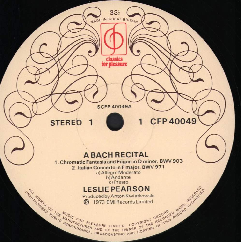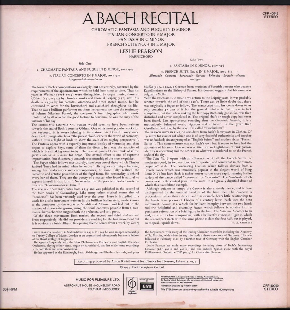 GRADING Our Grading System The table below is an overview of how our grading system works. The first grade is for the sleeve and second grade is for the media/disc, e.g. VG+/EX means that the item's sleeve is in Very Good Plus condition and the media/disc is in Excellent condition. If there is only one condition, e.g. /EX, it means that the item is not in a picture sleeve and that the media/disc is in excellent condition. Records that aren't in picture sleeves will either be in a company sleeve or a generic plain sleeve. If you have any questions, please get in touch. Condition Sleeve Media MINT (10/10) Mint, perfect Mint, perfect EX+ (9/10) Excellent plus, near mint Excellent plus, near perfect EX (8/10) Excellent, well looked after, clean, only slight signs of use Excellent, well looked after, clean, only slight signs of use EX- (7/10) Excellent minus, light wear and signs of use Excellent minus, light wear and signs of use VG+ (6/10) Very good plus, some moderate wear Very good plus, some scuffs, no deep marks VG (5/10) Very good, well used and worn Very good, well used and marked VG- (4/10) Very good minus, very worn Very good minus, very worn and marked GOOD (3/10) Good, some major wear Good, some major wear and scuffing FAIR (2/10) Fair, major wear Fair, major wear and scuffing POOR (1/10) Poor, severe wear Poor, severe wear and scuffing DELIVERY Combined Postage If you add all the items you wish to purchase from us to your shopping basket/cart, and then go to the checkout page from the shopping basket page, the shipping cost will be automatically combined. Packaging All of our items are parcelled using strong specially designed packaging, each vinyl in an order is placed in a clear plastic sleeve and plain paper white sleeve, and is separated from its cover (unless it is advertised as sealed), to prevent any damage during transit. If an item is sealed, and you would prefer the vinyl to be placed outside of its sleeve before dispatch, please let us know. Prices You can see all delivery options and prices for an item on the "Postage and payments" tab. Tracked delivery If you wish to have a tracking number with your order, please select the "Signed" or "Express" delivery option, "Standard" delivery does not include a tracking number. SHOP Click here to view our Ebay shop, with over 200,000 items in stock FAQ Does a used item include the original inner sleeve/insert/poster etc.? We will always include in the description if a used item includes any additional parts, e.g. "with inner" or "includes poster", if you know an item originally came with any additional parts, such as a printed inner sleeve, and it isn't mentioned in the description, then generally the used item won't include it, but please feel free to ask. New items will always be complete, unless otherwise specified. CATEGORIES Shop Home 10" Vinyl Records 12" Vinyl Records 7" Vinyl Records Cassettes (Tape) CDs (Compact Discs) LP Vinyl Records Music Memorabilia Other Artist Leslie Pearson Title A Bach Recital Format LP Vinyl Country UK Label Classics For Pleasure Catalogue Number CFP40049 Year 1973 Description sleeve has light ringwear and marks on back Condition (Sleeve/Disc) VG+/VG+ Track List A1. Chromatic Fantasia And Fugue In D Minor, BWV 903 Italian Concerto In F Major, BWV 971 - A2a. Allegro - A2b. Andante - A2c. Presto B1. Fantasia In C Minor, BWV 906 French Suite No. 6 In E Major, BWV 817 - B2a. Allemande - B2b. Courante - B2c. Sarabande - B2d. Gavotte - B2e. Polonaise - B2f. Bourée - B2g. Menuet - B2h. Gigue DELIVERY INFORMATION If you wish to have a tracking number with your order, please choose the Signed or Express delivery option, the Standard delivery option does not include a tracking number. Please note, the Express option for delivery outside of the UK includes a tracking number, but has the same delivery time as the Standard option. ABOUT US Vinyl Tap has been in the business of selling music for over 30 years, and in that period we have supplied many thousands of collectors and music fans around the globe with vinyl, CDs and music memorabilia. You can check out the over 200,000 items that we have in stock on our Ebay shop, here . Artist: Leslie Pearson - Title: A Bach Recital - Format: LP Vinyl - Country: UK - Label: Classics For Pleasure - Catalogue Number: CFP40049 - Year: 1973 - Description: sleeve has light ringwear and marks on back