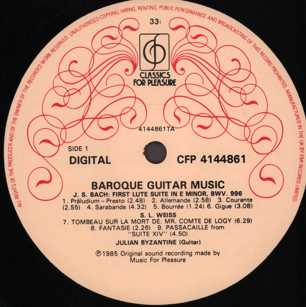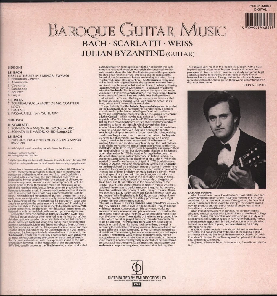 GRADING Our Grading System The table below is an overview of how our grading system works. The first grade is for the sleeve and second grade is for the media/disc, e.g. VG+/EX means that the item's sleeve is in Very Good Plus condition and the media/disc is in Excellent condition. If there is only one condition, e.g. /EX, it means that the item is not in a picture sleeve and that the media/disc is in excellent condition. Records that aren't in picture sleeves will either be in a company sleeve or a generic plain sleeve. If you have any questions, please get in touch. Condition Sleeve Media MINT (10/10) Mint, perfect Mint, perfect EX+ (9/10) Excellent plus, near mint Excellent plus, near perfect EX (8/10) Excellent, well looked after, clean, only slight signs of use Excellent, well looked after, clean, only slight signs of use EX- (7/10) Excellent minus, light wear and signs of use Excellent minus, light wear and signs of use VG+ (6/10) Very good plus, some moderate wear Very good plus, some scuffs, no deep marks VG (5/10) Very good, well used and worn Very good, well used and marked VG- (4/10) Very good minus, very worn Very good minus, very worn and marked GOOD (3/10) Good, some major wear Good, some major wear and scuffing FAIR (2/10) Fair, major wear Fair, major wear and scuffing POOR (1/10) Poor, severe wear Poor, severe wear and scuffing DELIVERY Combined Postage If you add all the items you wish to purchase from us to your shopping basket/cart, and then go to the checkout page from the shopping basket page, the shipping cost will be automatically combined. Packaging All of our items are parcelled using strong specially designed packaging, each vinyl in an order is placed in a clear plastic sleeve and plain paper white sleeve, and is separated from its cover (unless it is advertised as sealed), to prevent any damage during transit. If an item is sealed, and you would prefer the vinyl to be placed outside of its sleeve before dispatch, please let us know. Prices You can see all delivery options and prices for an item on the "Postage and payments" tab. Tracked delivery If you wish to have a tracking number with your order, please select the "Signed" or "Express" delivery option, "Standard" delivery does not include a tracking number. SHOP Click here to view our Ebay shop, with over 200,000 items in stock FAQ Does a used item include the original inner sleeve/insert/poster etc.? We will always include in the description if a used item includes any additional parts, e.g. "with inner" or "includes poster", if you know an item originally came with any additional parts, such as a printed inner sleeve, and it isn't mentioned in the description, then generally the used item won't include it, but please feel free to ask. New items will always be complete, unless otherwise specified. CATEGORIES Shop Home 10" Vinyl Records 12" Vinyl Records 7" Vinyl Records Cassettes (Tape) CDs (Compact Discs) LP Vinyl Records Music Memorabilia Other Artist Julian Byzantine Title Baroque Guitar Music Format LP Vinyl Country UK Label Classics For Pleasure Catalogue Number CFP4144861 Year 1985 Description 12 track stereo - sleeve has small tear and discoloration on front Condition (Sleeve/Disc) VG+/VG+ Track List J.S. Bach: First Lute Suite In E Minor, BWV.996 A 1. Praludium - Presto (2:53) A 2. Allemande (3:02) A 3. Courante (2:59) A 4. Sarabande (4:41) A 5. Bourée (1:28) A 6. Gigue (3:12) S.L. Weiss A 7. Tombeau Sur La Morte De Mr. Comte De Logy (6:39) A 8. Fantasie (2:35) A 9. Passacaille From "Suite XIV" (4:53) D. Scarlatti B 1. Sonata In A Major, Kk.332 (Longo.485) (3:47) B 2. Sonata In E Major, Kk.380 (Longo.23) (6:06) J.S. Bach B 3. Prelude, Fugue And Allegro In D Major, BWV.998 (13:29) DELIVERY INFORMATION If you wish to have a tracking number with your order, please choose the Signed or Express delivery option, the Standard delivery option does not include a tracking number. Please note, the Express option for delivery outside of the UK includes a tracking number, but has the same delivery time as the Standard option. WE HAVE MORE JULIAN BYZANTINE ITEMS IN STOCK We have more items in stock by this artist, click here to see them. ABOUT US Vinyl Tap has been in the business of selling music for over 30 years, and in that period we have supplied many thousands of collectors and music fans around the globe with vinyl, CDs and music memorabilia. You can check out the over 200,000 items that we have in stock on our Ebay shop, here . Artist: Julian Byzantine - Title: Baroque Guitar Music - Format: LP Vinyl - Country: UK - Label: Classics For Pleasure - Catalogue Number: CFP4144861 - Year: 1985 - Description: 12 track stereo - sleeve has small tear and discoloration on front