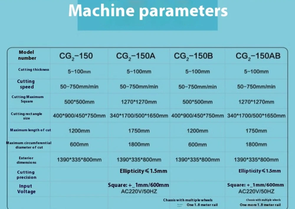 CG2-150 Profile Cutting Machine Cutting Round Square Fire Gas Cutting Machine Name: Profile cutting machine Model: CG2-150 Cutting thickness: 5-100mm Cutting speed: 50-750mm/min Cutting the largest square: 500*500mm Cutting rectangle size: 400*900/450*750mm Maximum cutting length: 1200mm Maximum cutting circle diameter: 600mm Size: 1390*335*800mm Features: 1. The body is made of aluminum ingot precision casting 2. The speed control system adopts the touch-control silicon antenna to adjust the speed, and the operation is stable 3. Diversified two-dimensional shapes can be cut according to the template within the specified range 4. The machine greatly reduces the labor intensity of moving the fuselage or steel plate, and improves the productivity 5. This machine is especially suitable for mass production of parts of the same shape 6. Suitable for shipbuilding, boiler, metallurgy, metal structure and other factories ————Physical photos————