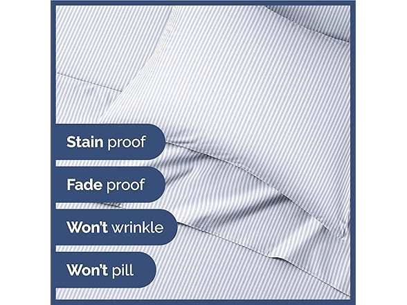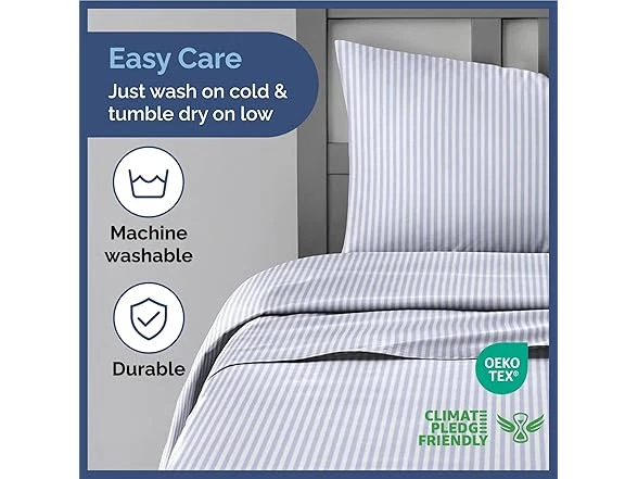 CGK 4 Piece Kids Sheet Set Condition: New Color: Blue Pinstripes Size: Queen Features Make bedtime a delightful experience for your little ones with our CGK Kids Bed Sheets. Crafted with love and care, these sheets are designed to provide ultimate comfort while adding a vibrant touch to your child's room. Here's why parents and kids alike adore them: Soft and Cozy: Our CGK Kids Bed Sheets are made from the finest quality materials, ensuring a soft and snuggly feel against your child's delicate skin. Whether it's naptime or a full night's sleep, your child will enjoy the utmost comfort. Back to school essentials. Colorful Dreams: Say goodbye to dull and boring bed sheets! CGK Kids Bed Sheets come in a dazzling array of colors and patterns. Let your child's imagination run wild as they choose from a variety of vibrant shades and playful designs. From cheerful rainbows to cute animals, there's a pattern for every personality. Fitted Perfection: We understand that kids can be active sleepers. That's why our bed sheets come with deep pockets and a secure elasticized fit. Say goodbye to tugging and adjusting sheets in the middle of the night. Our fitted design ensures a snug and wrinkle-free fit every time. Machine Washable: Life with kids can be messy, but cleaning their bed sheets doesn't have to be a hassle. Our CGK Kids Bed Sheets are machine washable, making cleanup a breeze. Just toss them in the washer, and they'll come out as good as new, ready for more adventures in dreamland. Multiple Patterns and Colors: Variety is the spice of life, and that holds true for your child's bedding. With CGK Kids Bed Sheets, you can switch up the look of their room anytime you like. Mix and match different patterns and colors to create a personalized space that reflects your child's unique style. Invest in quality, comfort, and creativity with CGK Kids Bed Sheets. Watch as your child drifts off to dreamland in the coziest, most colorful bedding they've ever had. Order now and make bedtime a cherished moment for your little one! FUN, BRIGHT PATTERNS, AND COLORS: CGK sheets are perfect for boys, girls, and toddlers with fun patterns making bedtime more exciting! Your son or daughter will love the vibrant and beautiful patterns, and you will love the quality! SOFT COOL AND COMFY: CGK kids’ sheets fit your child’s bedroom style and offer long-lasting quality. Made with a super soft and breathable microfiber material. Perfect for teens, toddlers, or children excited about their “big kid bed” keeping them cozy and ready for bedtime. OEKO-TEX CERTIFIED ensures that our kids' sheets are non-hazardous and safe for your children and the environment. Designed for your convenience. Bid farewell to wrinkles and ironing. Just wash, dry, and spread! With our fade-resistant quality, the vibrancy remains intact. SHEETS THAT DON’T BUDGE: Active sleeper or playful jumper, CGK sheets are here to stay. With a snug elastic fit, there’s no room for bunching or sliding. Count those sheep without any interruptions! PERFECTLY SIZED FOR YOUR LITTLE ONE: 4-piece Queen-size sheet set. Dimensions tailored to fit: 1 Flat Sheet (90″ x 102″), 1 Fitted Sheet (60″ x 80″), and 2 Pillowcases (20″ x 30″). Every piece is tailored for a snug fit. Specs In the Box: (1) CGK 4 Piece Kids Sheet Set