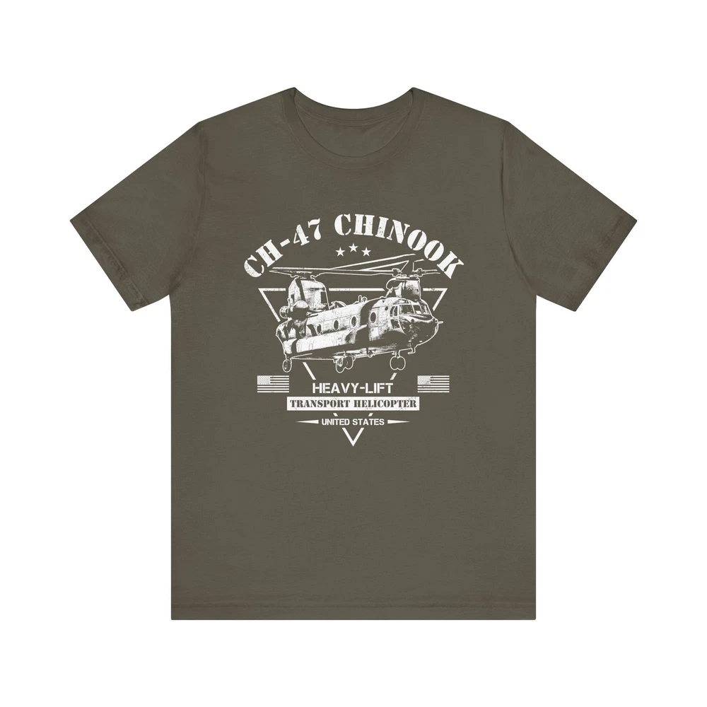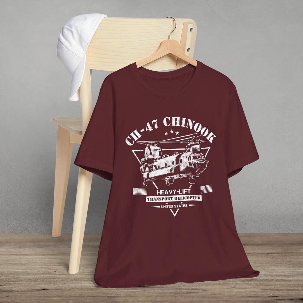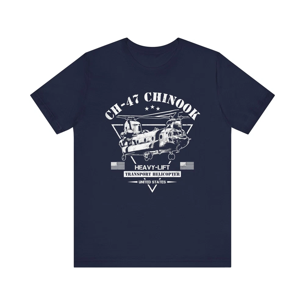 The CH-47 Chinook is an American heavy-lift transport helicopter. This stylish military helicopter design has a slight distressed look and is great for any occasion. Perfect for fans of army helicopters, aviation, military enthusiasts, pilots, soldiers and veterans. A great gift idea for Veterans Day! This classic unisex jersey short sleeve tee fits like a well-loved favorite. Soft cotton and quality print make users fall in love with it over and over again. These t-shirts have-ribbed knit collars to bolster shaping. The shoulders are tapered for a better fit over time. Dual side seams hold the garment's shape for longer. .: Made with 100% Airlume combed and ring-spun cotton, a lightweight fabric (4.2 oz/yd² (142 g/m²)) that is easy to layer, breathable. Perfect for active and leisure wear. .: The retail fit that is perfect for casual and semi-formal settings. The crew neckline adds a classic, neat style that's perfect for accessorizing. .: Manufactured in the US and internationally in humane, no-sweat-shop, sustainable way and is part of the Fair Labor Association as well as Platinum WRAP certified. .: The tear-away label minimizes skin irritations. .: Fabric blends: Ash and Heather Prism colors - 99% Airlume combed and ring-spun cotton, 1% polyester; Heather colors - 52% cotton, 48% polyester; Athletic Heather and Black Heather - 90% cotton, 10% polyester. ITEMS ARE PRINTED AND SHIPPED FROM THE US. As these items are made-to-order we can not accept returns, exchanges or refunds for wrong sizes ordered. Please make sure you have checked the measurements shown on the size chart carefully. Size charts are displayed along with the images on the product page. Please ensure you have read the item description and our store policies carefully before purchase. General product safety regulation (GPSR) EU representative : HONSON VENTURES LIMITED, 3, Gnaftis House flat 102, Limassol, Mesa Geitonia, 4003, CY Product information : Bella+Canvas 3001, 2 year warranty in EU and Northern Ireland as per Directive 1999/44/EC Care instructions : Machine wash: cold (max 30C or 90F), Non-chlorine: bleach as needed, Tumble dry: low heat, Iron, steam or dry: medium heat, Do not dryclean.