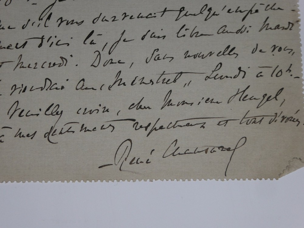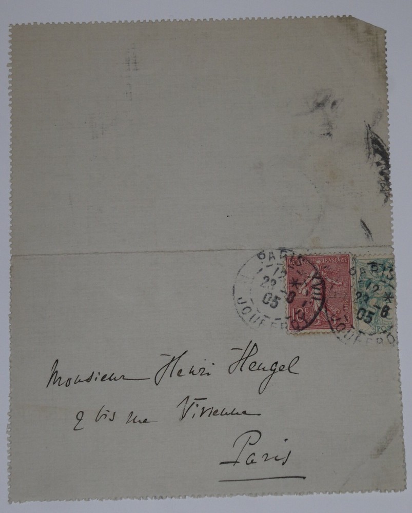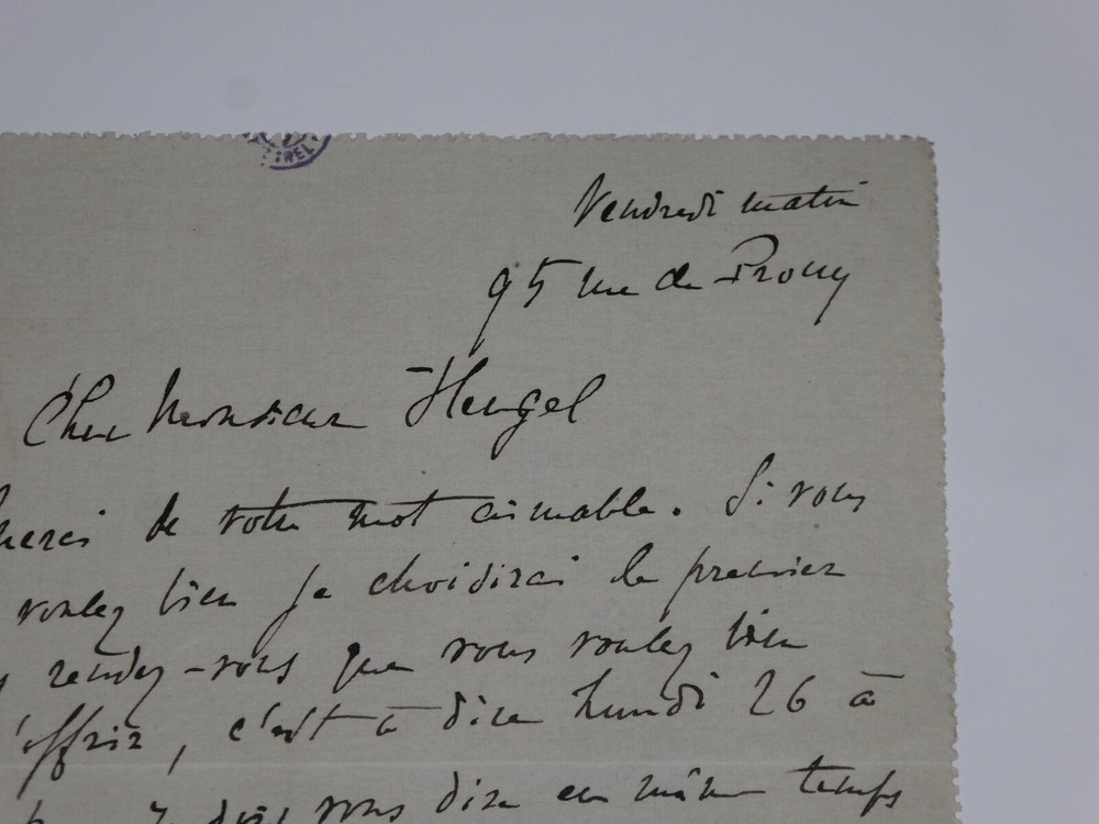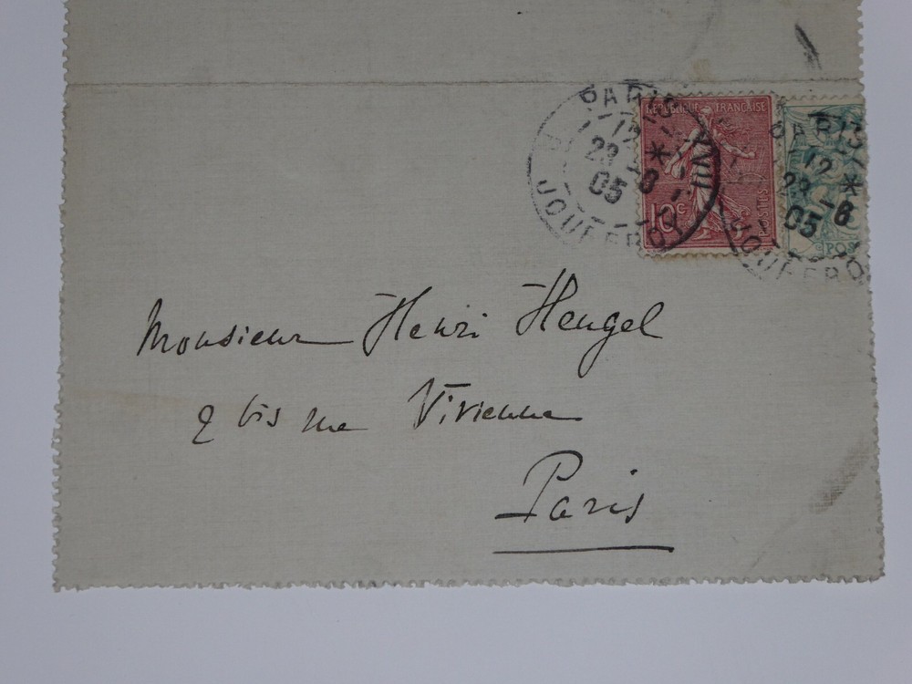 René CHANSAREL. Carte lettre autographe signée et affranchie le 23 juin 1905, Paris. Carte lettre en une page adressée à Henri Heugel afin de le remercier de son "mot aimable" et aimerait convenir d'un rendez-vous avec lui. Dimensions : 11.3 x 14.4 cm. 1 page. Etat : Bon état de conservation. Présence du tampon des archives Ménestrel. Légère usure sur le verso à cause de l'encre. René Chansarel, né en 1864 et mort en 1945, est un pianiste, compositeur et proche de Claude Debussy. Henri Heugel, né le 3 mai 1844 à Paris et mort le 11 mai 1916 dans la même ville, est l'auteur de plusieurs ouvrages littéraires estimés. Directeur de la maison d'éditions musicales le Ménestrel, il se retire en 1948, laissant les commandes à ses deux fils François et Philippe. En 1980, la maison Heugel est rachetée par les éditions Alphonse Leduc. Il fut nommé chevalier de la Légion d'honneur. Envoi soigné dans un emballage rigide et étanche. Satisfait ou remboursé. Si vous n'êtes pas entièrement satisfait, je reprends la marchandise avec retour à ma charge pour l'Europe et à la charge de l'acheteur pour le reste du monde. N’hésitez pas à visiter ma boutique et affiner vos recherches en fonction des catégories qui vous intéressent. Ma boutique L'Art Délivré. Lettres autographes, vieux papiers, livres anciens, photographies, gravures, timbres… Nous expertisons et/ou rachetons dans toute la France vos lettres, collections de lettres et livres anciens. Merci de votre visite. Jérôme KAYSER. Carte lettre en une page adressée à Henri Heugel afin de le remercier de son "mot aimable" et aimerait convenir d'un rendez-vous avec lui. Henri Heugel, né le 3 mai 1844 à Paris et mort le 11 mai 1916 dans la même ville, est l'auteur de plusieurs ouvrages littéraires estimés. Directeur de la maison d'éditions musicales le Ménestrel, il se retire en 1948, laissant les commandes à ses deux fils François et Philippe. En 1980, la maison Heugel est rachetée par les éditions Alphonse Leduc. Il fut nommé chevalier de la Légion d'honneur. Satisfait ou remboursé. Si vous n'êtes pas entièrement satisfait, je reprends la marchandise avec retour à ma charge pour l'Europe et à la charge de l'acheteur pour le reste du monde. N’hésitez pas à visiter ma boutique et affiner vos recherches en fonction de