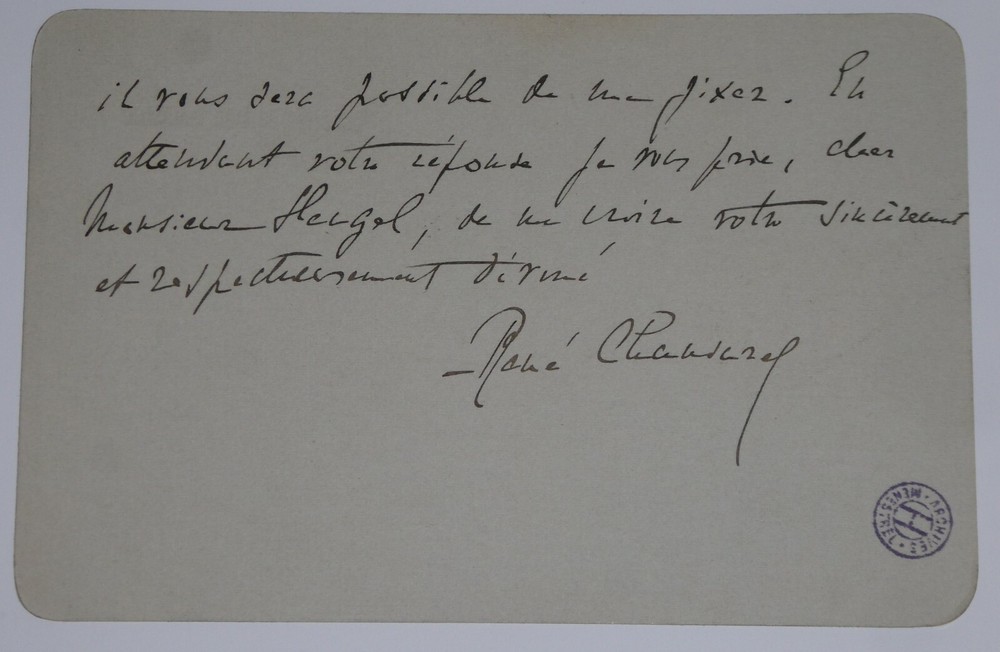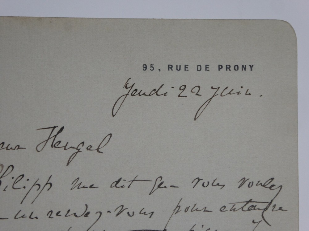 René CHANSAREL. Lettre autographe signée, Paris. Lettre en deux pages sur papier semi rigide format carte adressée à Henri Heugel car ce dernier lui a accordé une entrevue afin qu'il puisse écouter des morceaux de chant et de piano. Il veut donc convenir des détails de la rencontre. Dimensions : 12.5 x 8.5 cm. 2 pages. Etat : Bon état de conservation. Présence du tampon des archives Ménestrel. René Chansarel, né en 1864 et mort en 1945, est un pianiste, compositeur et proche de Claude Debussy. Henri Heugel, né le 3 mai 1844 à Paris et mort le 11 mai 1916 dans la même ville, est l'auteur de plusieurs ouvrages littéraires estimés. Directeur de la maison d'éditions musicales le Ménestrel, il se retire en 1948, laissant les commandes à ses deux fils François et Philippe. En 1980, la maison Heugel est rachetée par les éditions Alphonse Leduc. Il fut nommé chevalier de la Légion d'honneur. Envoi soigné dans un emballage rigide et étanche. Satisfait ou remboursé. Si vous n'êtes pas entièrement satisfait, je reprends la marchandise avec retour à ma charge pour l'Europe et à la charge de l'acheteur pour le reste du monde. N’hésitez pas à visiter ma boutique et affiner vos recherches en fonction des catégories qui vous intéressent. Ma boutique L'Art Délivré. Lettres autographes, vieux papiers, livres anciens, photographies, gravures, timbres… Nous expertisons et/ou rachetons dans toute la France vos lettres, collections de lettres et livres anciens. Merci de votre visite. Jérôme KAYSER. Lettre en deux pages sur papier semi rigide format carte adressée à Henri Heugel car ce dernier lui a accordé une entrevue afin qu'il puisse écouter des morceaux de chant et de piano. Il veut donc convenir des détails de la rencontre. Henri Heugel, né le 3 mai 1844 à Paris et mort le 11 mai 1916 dans la même ville, est l'auteur de plusieurs ouvrages littéraires estimés. Directeur de la maison d'éditions musicales le Ménestrel, il se retire en 1948, laissant les commandes à ses deux fils François et Philippe. En 1980, la maison Heugel est rachetée par les éditions Alphonse Leduc. Il fut nommé chevalier de la Légion d'honneur. Satisfait ou remboursé. Si vous n'êtes pas entièrement satisfait, je reprends la marchandise avec retour à ma charge pour l'Europe et à la charge de l'acheteur pour
