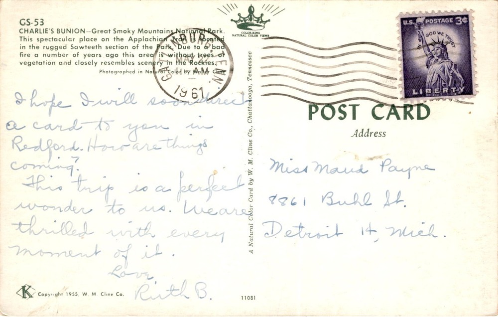 The postcard features a photograph of Charlie's Bunion in the Great Smoky Mountains National Park, located in the rugged Sawteeth section of the Appalachian Trail. The area was affected by a fire several years prior, resulting in a landscape filled with rocks and sparse vegetation. The scenery closely resembles the natural beauty of the area.