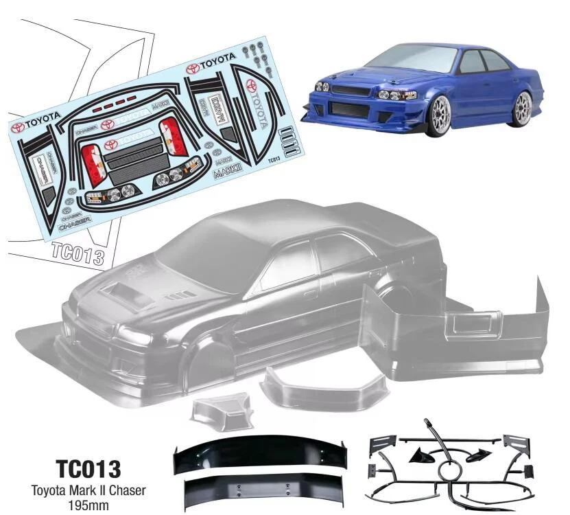 CHASER MARK 2 II JZX100 1/10 Clear Lexan Body W/Light Buckles + Rear Wing for Rc Drift Car Tamiya tt02 tt01 Kyosho fazer mst rmx Toyota Mark II Chaser WB 258mm Width 195mm Material:PC Clear Lexan Body W/Light Buckles With Rear Wing Incl: Chaser Decal Sheet Window Mask For 1/10 on road Remarks:You need to complete these stickers yourself! The shipping is the same as the picture Note: Due to Different Monitor, the color may have difference.