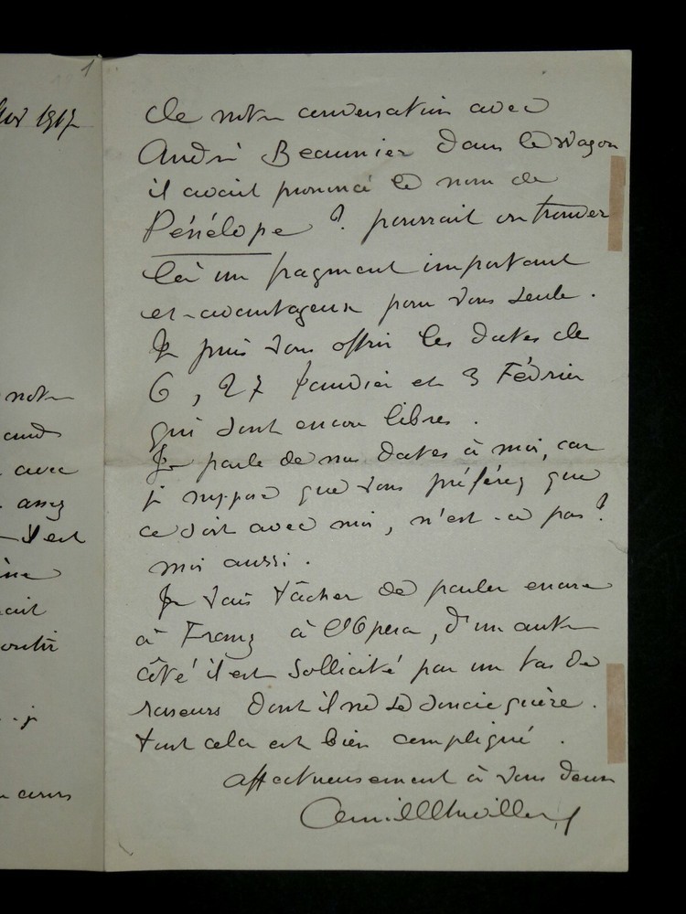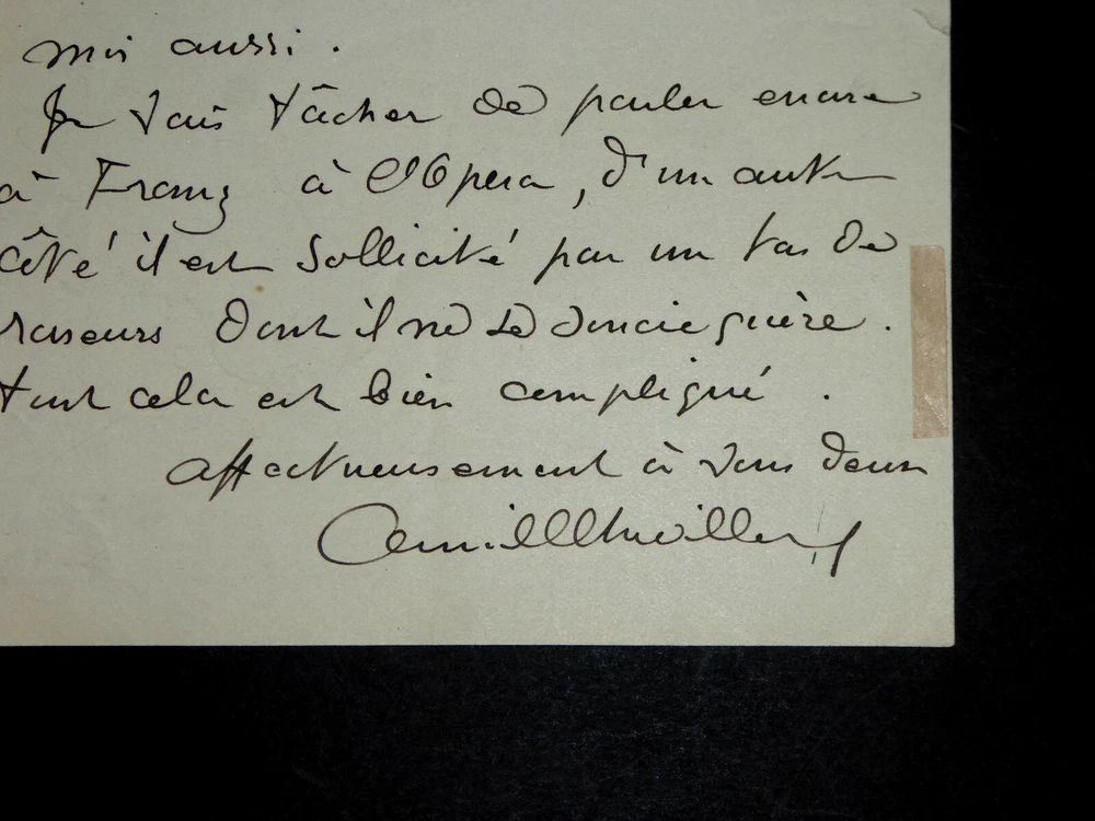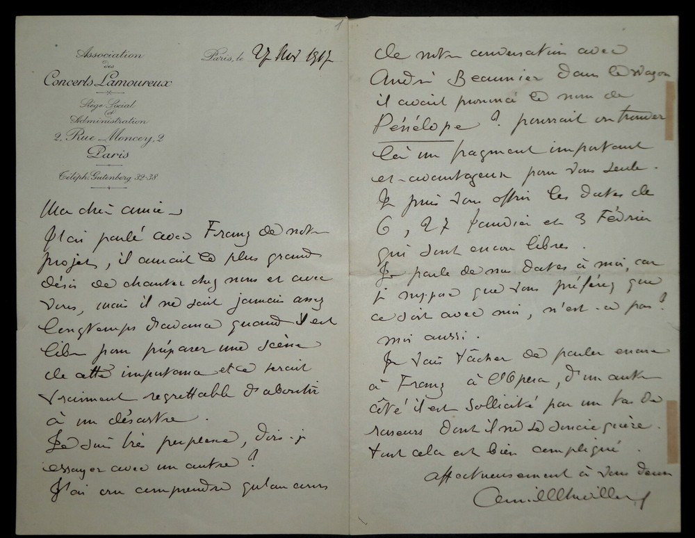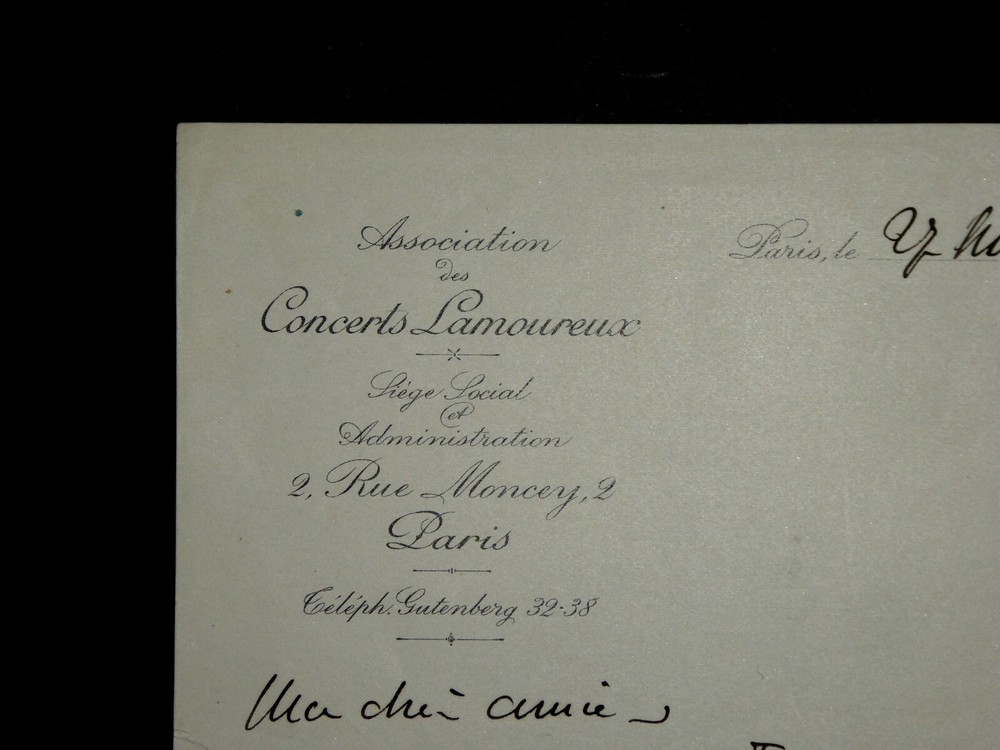 Camille CHEVILLARD. Lettre autographe signée et datée du 27 novembre 1917, Paris. Lettre en deux pages sur papier à en-tête de l' Association des Concerts Lamoureux "siège social et administration" adressée à une amie mentionnant un "projet" en commun : "J'ai parlé avec Franz de notre projet, il aurait le plus grand désir de chanter chez nous et avec vous (...)" bien qu’apparemment il ne sait pas quand il pourra se joindre à eux car "il ne sait jamais assez longtemps d'avance quand il est libre". Il se demande donc s'il ne doit pas essayer avec une autre personnalité afin de trouver quelqu'un d'assez disponible pour "préparer une scène de cette importance". Il avait déjà demandé au critique littéraire André Beaunier qui il pensait pouvoir recommander pour ce "projet". Dimensions : 13.5 x 21.2 cm. 2 pages. Etat : Bon état de conservation malgré la présence d'onglets. Alexandre Camille Chevillard, né à Montmartre le 14 octobre 1859 et mort à Chatou le 30 mai 1923, est un compositeur et chef d'orchestre français. Wikipédia André Beaunier est un romancier et critique littéraire français, né le 22 septembre 1869 à Évreux, et, mort le 10 décembre 1925 en son domicile dans le 7ᵉ arrondissement de Paris. Wikipédia Envoi soigné dans un emballage rigide et étanche. Satisfait ou remboursé. Si vous n'êtes pas entièrement satisfait, je reprends la marchandise avec retour à ma charge pour l'Europe et à la charge de l'acheteur pour le reste du monde. N’hésitez pas à visiter ma boutique et affiner vos recherches en fonction des catégories qui vous intéressent. Ma boutique L'Art Délivré. Lettres autographes, vieux papiers, livres anciens, photographies, gravures, timbres… Nous expertisons et/ou rachetons dans toute la France vos lettres, collections de lettres et livres anciens. Merci de votre visite. Jérôme KAYSER. Lettre en deux pages sur papier à en-tête de l' Association des Concerts Lamoureux "siège social et administration" adressée à une amie mentionnant un "projet" en commun : "J'ai parlé avec Franz de notre projet, il aurait le plus grand désir de chanter chez nous et avec vous (...)" bien qu’apparemment il ne sait pas quand il pourra se joindre à eux car "il ne sait jamais assez longtemps d'avance quand il est libre". Il se demande donc s'il ne doit pas essayer avec une autre personnalité afin de trouver quelqu'un d'assez disponible pour "préparer une scène de cette importance". Il avait déjà demandé au critique littéraire André Beaunier qui il pensait pouvoir recommander pour ce "projet". André Beaunier est un romancier et critique littéraire français, né le 22 septembre 1869 à Évreux, et,