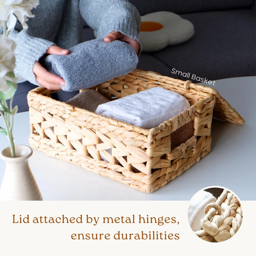 πΏ [πππππππ ππππππππ] Handwoven from water hyacinth, these lidded wicker baskets add a warm atmosphere to your home. Durable fibers and chemical-free, they will accompany your home for a long time! π§‘ [ππππππ πππππππππ πππππππ] Designed with a wavy open-weave pattern, these woven baskets are an irresistible item to mix and match with your furniture. Its appearance is suitable for many home decor styles, from rustic to bohemian. π¦ [ππππππ π πππππ] Our wicker baskets with lids are woven around a sturdy metal wireframe that reinforce their structure under any weight. Not only do they add a touch of style to your home, their flexible strands with steel frame can reliably withstand everyday use. Store up to 12 pounds in the large-size basket! π― [ππππππππ ππππππππ] These versatile baskets serve multiple purposes, including closet organization, toy storage π§Έ, bathroom tidying π§», pantry organization πΏ, book & magazine storage π, under-bed storage, and more. π§° [πππππ-ππ πππππππ] With our built-in handles, you can easily move these baskets everywhere in your home. The handles are specially crafted by water hyacinth which is softer than other natural material to make sure that there is no splinter that can piercing your skin. β [ππππ] Each square hyacinth basket is handcrafted, which may result in slight variations in shape, size, and color. This set includes three sizes: L14" x W11" x H7", L12.5" x W9" x H6", and L11" x W8" x H5". Suitable for indoor use only; All new wicker storage baskets have a particular natural smell of fibers that gradually disappears.