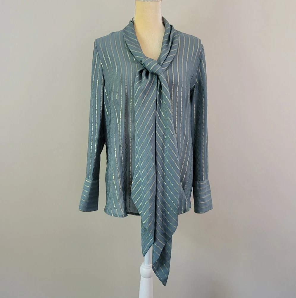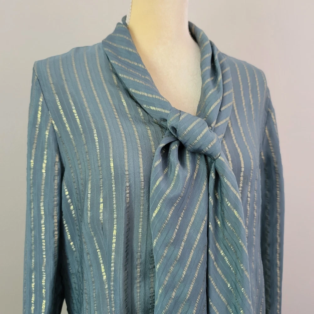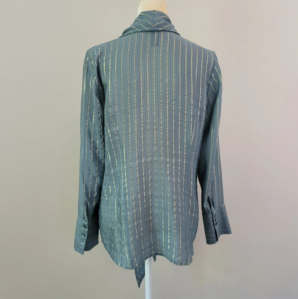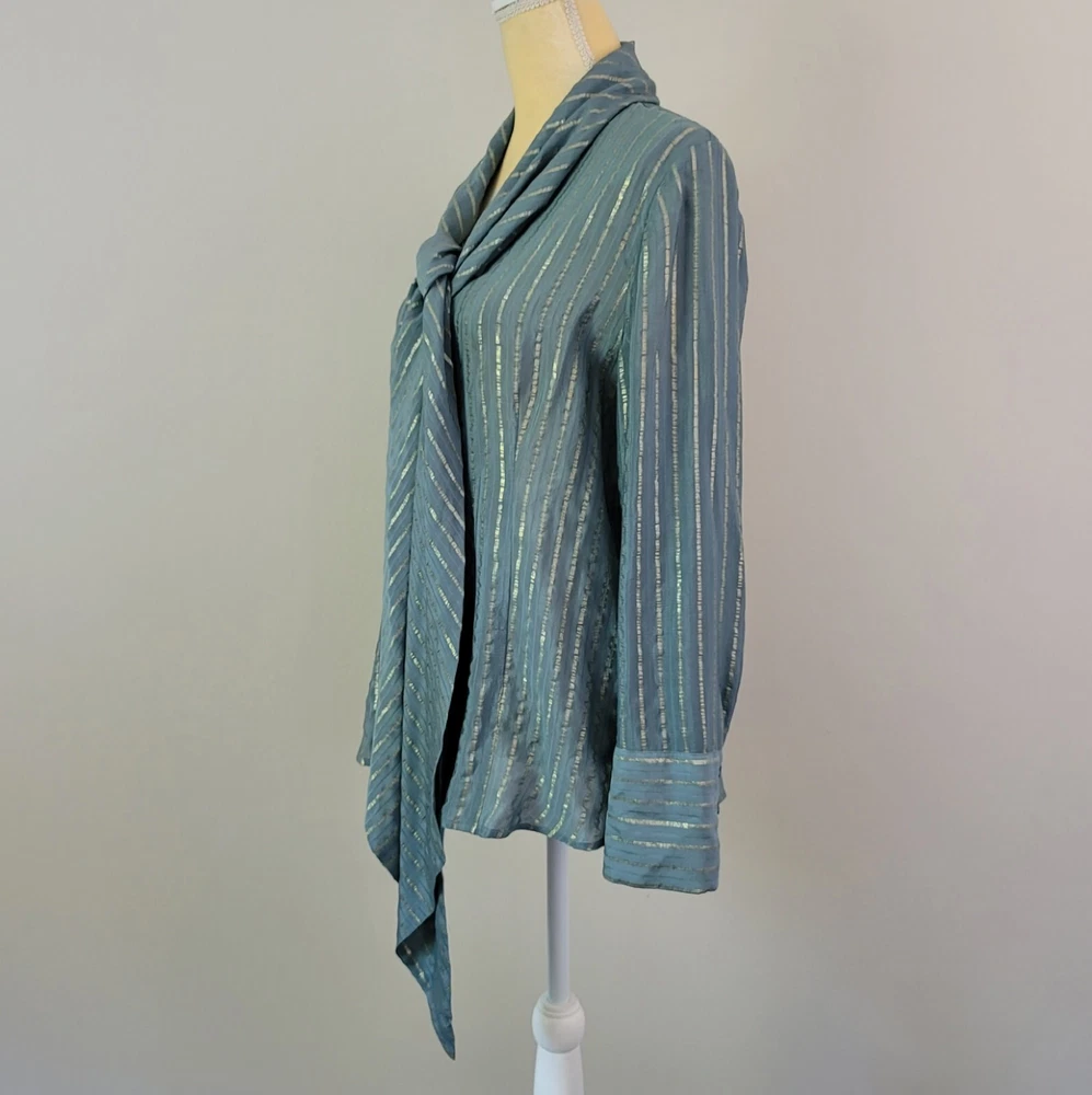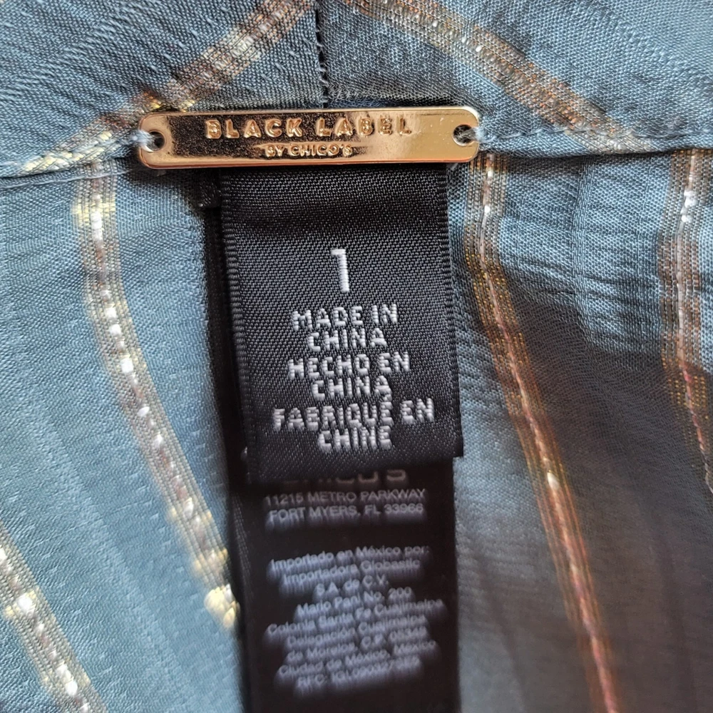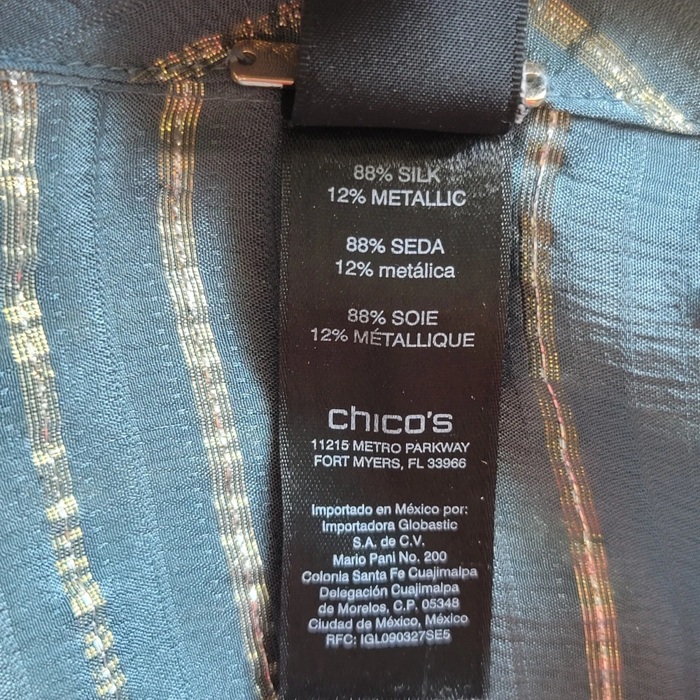 CHICO'S BLACK LABEL SILK BLOUSE in VENUS TEAL Size 1/Medium 100% silk with metallic threads Self-tie neck 21" across chest, 25" length; measurements are flat-lay Shipping - Ships via USPS within 3 business days once payment is received. Shipping quoted is within the continental U.S. All international purchases are processed by the eBay Global Shipping Program. Payment - Payments managed by eBay. PayPal and all major credit cards are accepted. Returns - Buyer is responsible for return shipping. ***Thank you for visiting, and feel free to check out my other listings. If more than one item is purchased, shipping will be combined.***