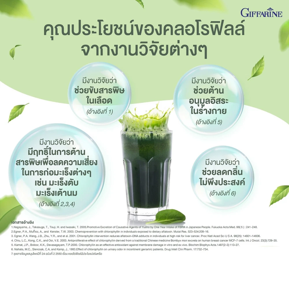Chlorophyll Diet Slim Weight Control Fiber Detox No Sugar Good Health Skin Care . CONDITION : New BRAND : Giffarine TYPE : Supplement for Healthy SIZE : 1 pack = 30 Sachets (1 sachet = 1 g) NOTIFICATION NUMBER : 13-1-03440-1-0077 . Packed with benefits from powerful ingredients that help fight free radicals, detoxify the body, boost immunity, control harmful bacteria, stimulate the digestive system, enhance calcium absorption, and reduce unpleasant body odors. Backed by various research studies, chlorophyll has been shown to inhibit several types of carcinogens. Combined with apple extract and vitamin C, it also helps reduce inflammation, slow down aging, and stimulate collagen production. . Simply mix "Giffarine C-O Chlorophyll" with 1.5 liters of water and refrigerate for a refreshing drink throughout the day. It helps nourish your body from within, keeping you energized and ready for any activity. Perfect for everyone in the family, especially those who want to maintain good health, glowing skin, a healthy digestive system, and smooth bowel movements—or those dealing with unwanted body or bad breath odors. . DIRECTIONS : Take 1 sachet (1 gram) daily mixed with 1.5 liters of water. Can be eaten all day long. For best quality, it should be consumed within 1 day . FDA Registration Number : 13-1-03440-1-0077 Packaging Size : 1 pack = 30 Sachets (1 sachet = 1 g) Net Wt. : 60 g. . About Giffarine : Giffarine is a trusted brand renowned for its commitment to quality in health and dietary supplements. We prioritize natural ingredients and rigorous quality control processes to ensure safety and effectiveness in all our products. . SHIPPING & HANDLING : - Shipping via Air Mail package. - Product will be shipped from Thailand with Tracking Number - The buyer is responsible for paying import taxes. - Item will be shipped within 1-2 business days after received your payment. - Delivery Time America 2-4 Weeks . RETURN & CLAIM : After receiving an item. If you are unsatisfied you can return the item for a full refund within 30 days. The item must be returned in original condition. . Thank you very much for your purchasing. . Welcome to my store every times. Siam910-4289