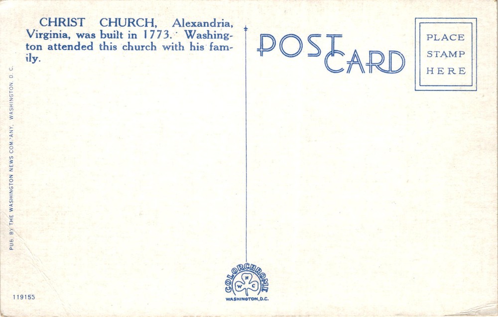 MAKE AN OFFER. THE MORE YOU BUY THE BETTER DEAL I WILL ACCEPT The postcard features a picture of Christ Church in Alexandria, Virginia, where George Washington and his family worshiped. The church was built in 1773 and has historical significance as a place where Washington attended services. The postcard was published by the Washington News Company in Washington, D.C.