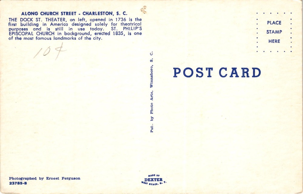 The postcard depicts Church Street in Charleston, South Carolina. The prominent buildings featured include the Dock Street Theater and St. Philip's Episcopal Church. The Dock Street Theater, opened in 1736, is notable for being the first building in America designed specifically for theatrical performances. It remains in operation to this day. St.