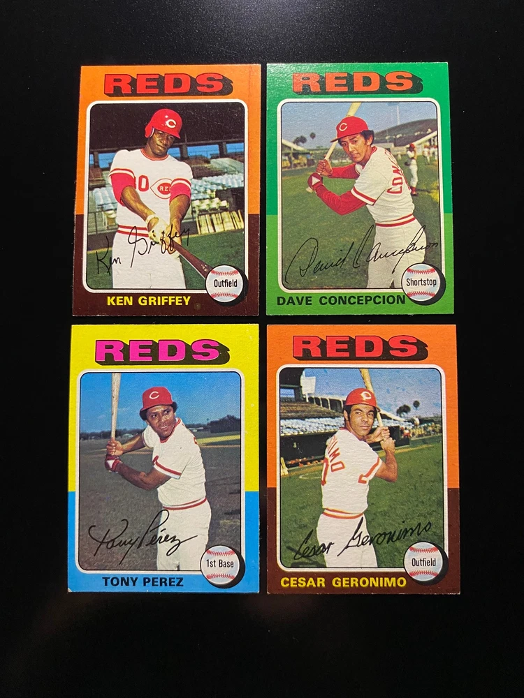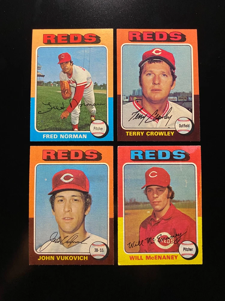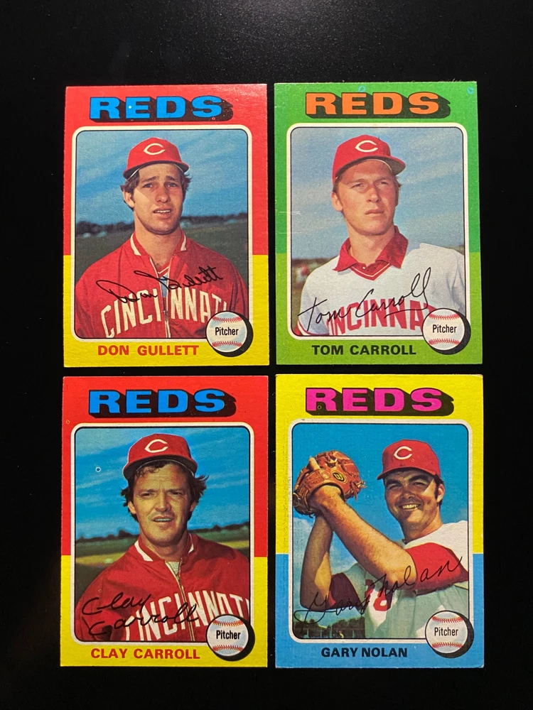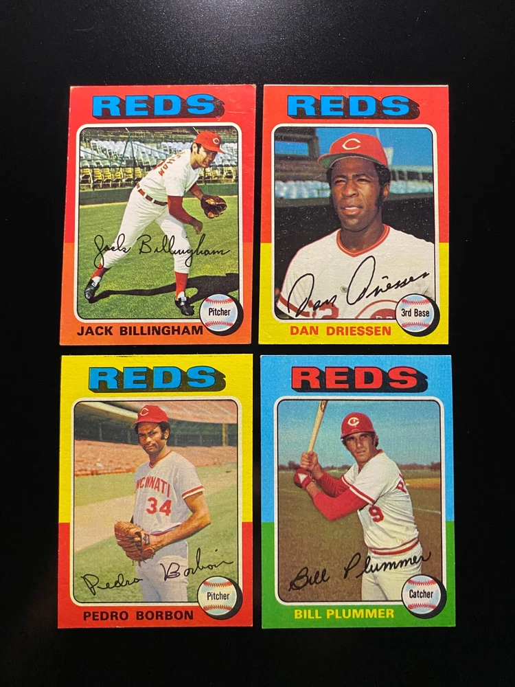 Number of Cards: 31 Type: Sports Trading Card Sport: Baseball League: Major League (MLB) Manufacturer: Topps Set: 1975 Topps Cincinnati Reds Country of Origin: United States Year Manufactured: 1975 Team: Cincinnati Reds Player/Athlete: Clay Carroll, Dave Concepcion, Don Gullett, Fred Lynn, Gary Nolan, George Foster, Jack Billingham, Joe Morgan, Johnny Bench, Ken Griffey, Pedro Borbon, Pete Rose, Rawly Eastwick, Sparky Anderson, Tony Perez, Ed Armbrister, Pat Darcy, Cesar Geronimo, Tom Carroll