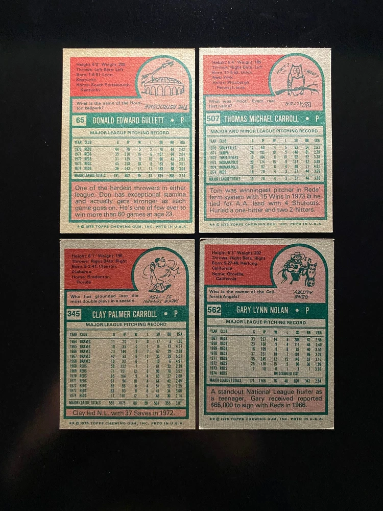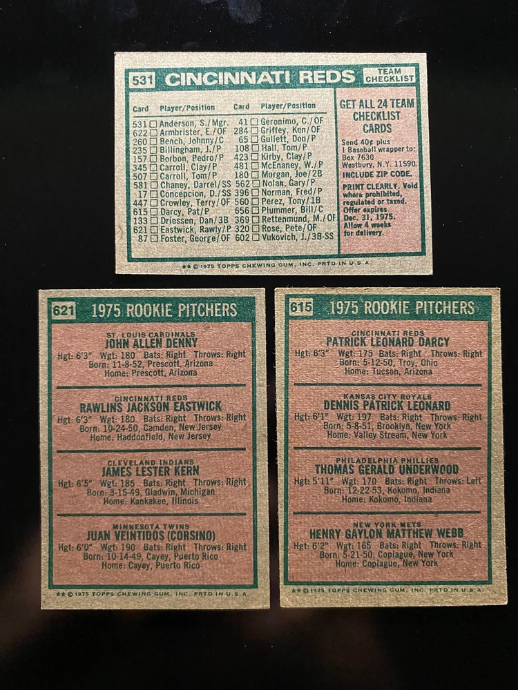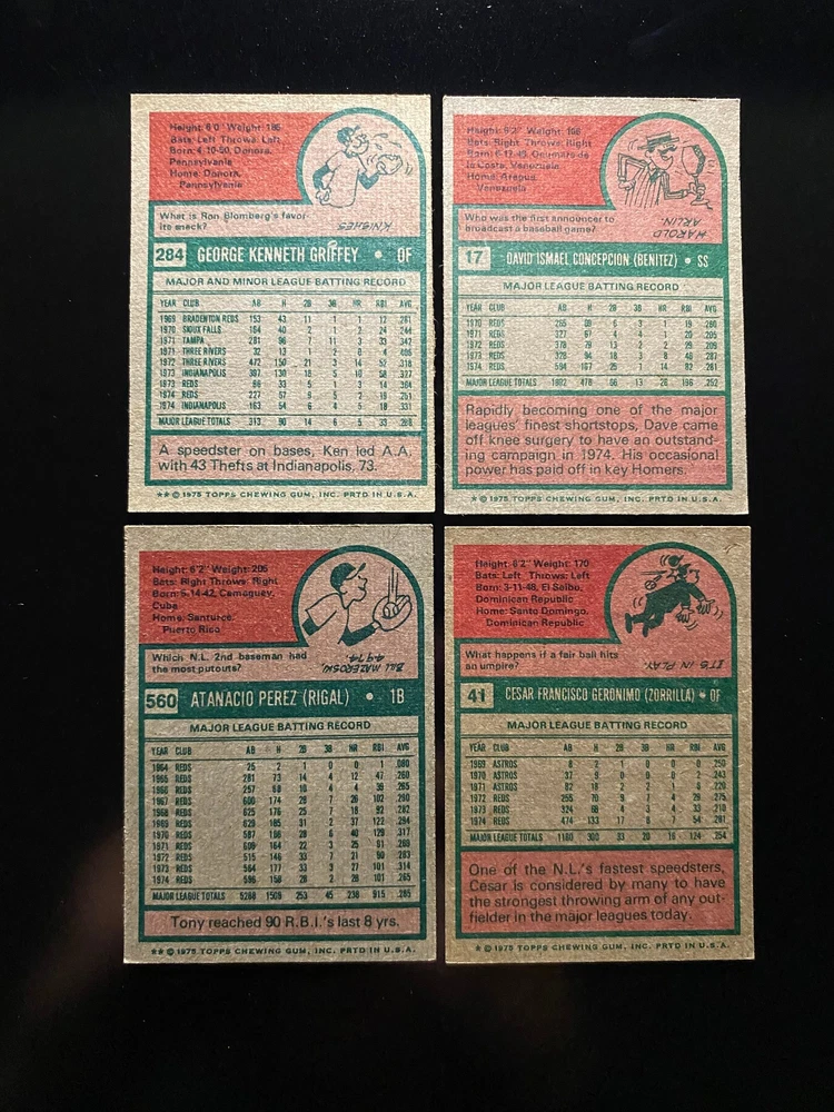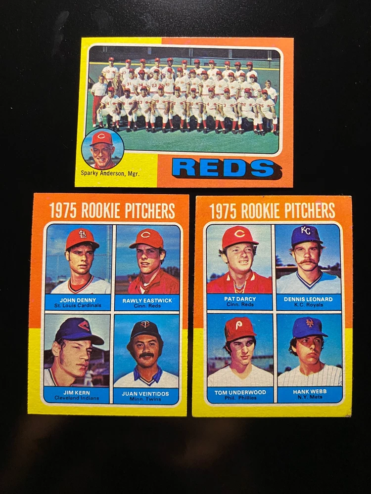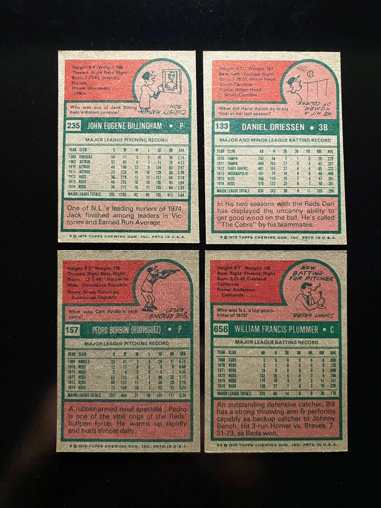 Number of Cards: 31 Type: Sports Trading Card Sport: Baseball League: Major League (MLB) Manufacturer: Topps Set: 1975 Topps Cincinnati Reds Country of Origin: United States Year Manufactured: 1975 Team: Cincinnati Reds Player/Athlete: Clay Carroll, Dave Concepcion, Don Gullett, Fred Lynn, Gary Nolan, George Foster, Jack Billingham, Joe Morgan, Johnny Bench, Ken Griffey, Pedro Borbon, Pete Rose, Rawly Eastwick, Sparky Anderson, Tony Perez, Ed Armbrister, Pat Darcy, Cesar Geronimo, Tom Carroll