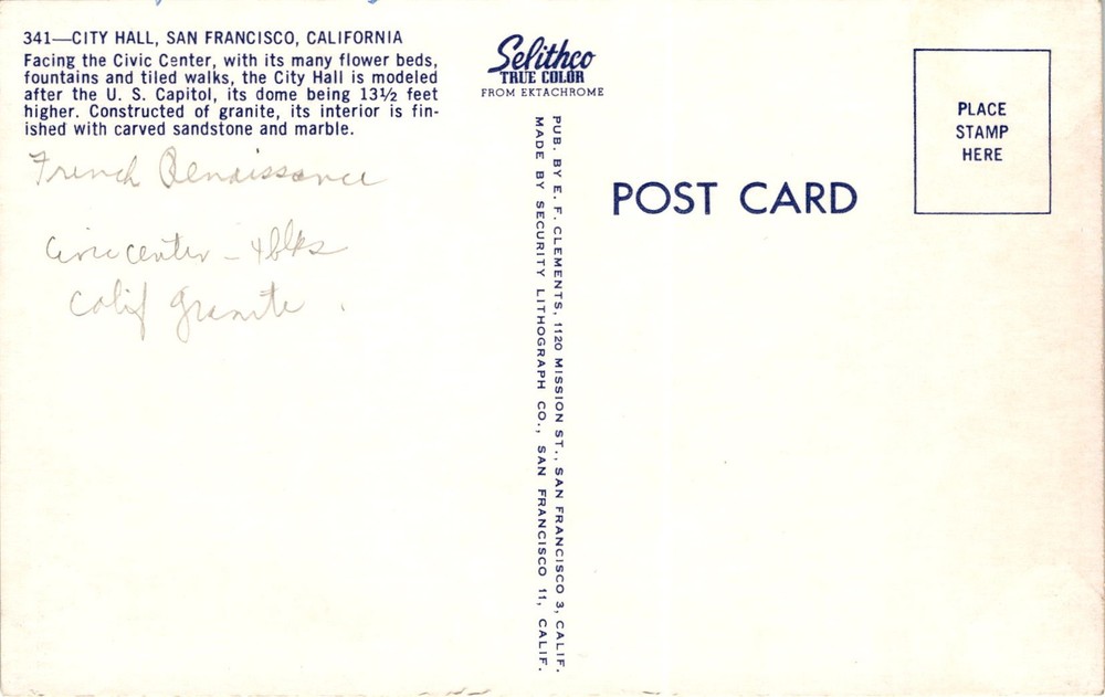 The postcard features an image of City Hall in San Francisco, California. The City Hall is located in the Civic Center area of San Francisco, known for its beautiful flower beds, fountains, and tiled walks. The building is modeled after the U.S. Capitol, with a dome that is 1312 feet high.