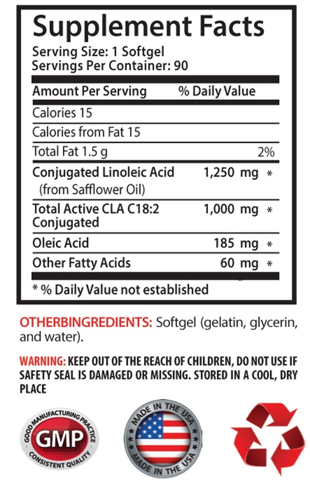 CLA 1250mg Diet Supplement, Increases Metabolic Rate, Decreases Abdominal Fat, Enhances Muscle Growth, Reduces Food-Induced Allergic Reactions. Body Fat Burner, Lean Muscle. (3 Bottles, 270 Softgels) Made In USA CLA or Conjugated Linoleic Acid: What is it? CLA stands for conjugated linoleic acid. It is a naturally occurring trans-fatty acid made from the omega-6 class of essential fatty acids. Since it is not man-made, you should view it differently from classic “trans-fats,” which are almost certainly bad for your health. On the other hand, CLA may actually be health-promoting. CLA is comprised of at least 28 isomers (different structural forms of the same molecule), and certain specific isomers may have different effects on the human body. However, since essentially all of the available CLA supplements contain a mixture of isomers, we will look at CLA as a whole instead of specific isomers. CLA is a short abbreviation for conjugated linoleic acid found in most diets. Since our bodies cannot make this fatty acid, it can only be acquired within the diet. Meat, cheese and dairy products, which are food from ruminant animals (animals that chew a cud) provide these food supplements. CLA: Can This Fatty Acid Help You Get Thin: CLA is related to the omega-6 fatty acids, one of the two types of essential fatty acids that help the body increase metabolic rates, boost the immune system and keep cholesterol levels in check. CLA is found in dairy and animal fats, such as beef, lamb, whole milk, and eggs, but cannot be produced by the human body. CLA not only reduces body fat but also increases muscle strength and exercise endurance. According to the research project manager, individuals in the CLA group lost six more pounds of body fat, on average, compared to those in the placebo group. Can CLA help with weight loss? CLA is a lipid — that’s an organic substance that can’t be dissolved in water. Types of lipids include cholesterol, triglycerides, and fatty acids; CLA is part of the fatty acid group. When taken as a supplement, CLA gets taken up into the body’s fat cells, where it can help break down stored fat and release it into the bloodstream. When taken alongside a healthy diet, CLA can be a catalyst, giving the body a helping hand burning fat. It seems CLA has the ability to increase basal metabolic rates which means food is converted more efficiently into energy. This may, indeed, help to reduce body fat by keeping fat cells from increasing in size (rather than shrinking large fat cells). This has the effect of altering the body’s fat-to-muscle ratio. Studies suggest CLA also increases muscle strength which allows for increased and vigorous activity as well as endurance in an exercise program useful in weight loss and management. CLA Bodybuilding Benefits: CLA is a highly rated fat loss supplement. It is a fatty acid that has the ability to help increase muscle mass while burning fat at the same time. CLA encourages your body to burn stored fat as fuel. It protects existing muscle from being used as fuel and enhances recovery. “More muscle, less fat” is a common theme in bodybuilding circles. Resistance training, cardio, and a healthy diet and supplementation plan usually do the trick, but for an added boost to that time-tested formula, the healthy fat called conjugated linoleic acid — CLA for short — is definitely worth checking out. CLA - Bigger and Leaner: Supplemental CLA has been shown to decrease body fat when it’s combined with resistance training. One report in a 2001 issue of The Journal of International Medical Research showed that men and women who took 0.6 grams of CLA (as Tonalin, which contains equal parts c9,t11 and t10,c12) three times a day and combined that with regular workouts for 12 weeks lost body fat without a change in bodyweight. CLA use among athletes and mainstream fitness enthusiasts is increasing at an astonishing rate. Supplement Facts: Conjugated Linoleic Acid (from Sa ower Oil) 1,250 mg Total Active CLA C18:2 Conjugated 1,000 mg Oleic Acid 185 mg Other Fatty Acids 60 mg Other Ingredients: Softgel (gelatin, glycerin, and water). Serving Size: 1 Softgel, Servings Per Container: 90 DIRECTION: As a dietary supplement adults take one(1) softgel capsule with each meal or as directed by a health care professional. CAUTION: Do not exceed recommended dose.Pregnant or nursing mothers, children under the age of 18 and individuals with a known medical condition should consult a physician before using this or any dietary supplement. *These statements have not been evaluated by the Food and Dug Administration. Feedback From Buyer Date/time A great transaction! g********e ( 1026 ) 2017-02-18 01:33:35 A great transaction! g********e ( 1026 ) 2017-02-18 01:33:24 Seller says what he means, and does what he says...what's not to like.RECOMMEND! d***********4 ( 43 ) 2017-02-17 19:36:44 Very good c*****6 ( 11 ) 2017-02-17 19:36:00 good price, fast shipping b*******0 ( 422 ) 2017-02-17 15:28:49 just as advertised f************0 ( 235 ) 2017-02-17 11:28:40 good t******7 ( 35 ) 2017-02-17 06:27:43 Super fast delivery s******4 ( 220 ) 2017-02-17 01:54:19 Good product with fast shipping... r*******5 ( 533 ) 2017-02-17 01:02:38 Everything was great!!! I'll definitely be doing more business with you soon!!! o******0 ( 232 ) 2017-02-16 19:09:04 Very good c********2 ( 13 ) 2017-02-16 16:30:07 Thank you! s**************l ( 573 ) 2017-02-16 13:02:34 very fast shipping, thanks so much 2**************n ( 486 ) 2017-02-15 04:23:58 Fast shipping. Great product. Good price! n***********h ( 525 ) 2017-02-14 21:35:40 Thanks f******4 ( 85 ) 2017-02-14 16:36:15 muy rapido p***********y ( 308 ) 2017-02-14 15:49:53 Nice as described r**********9 ( 137 ) 2017-02-14 10:17:42 Fair price ...Pic. as described.......Good communication.....Fast /Fair Shipping m********d ( 412 ) 2017-02-14 06:32:16 Fast shipping! 0**p ( 828 ) 2017-02-14 02:20:55 AAA+++ e*********i ( 629 ) 2017-02-14 02:1