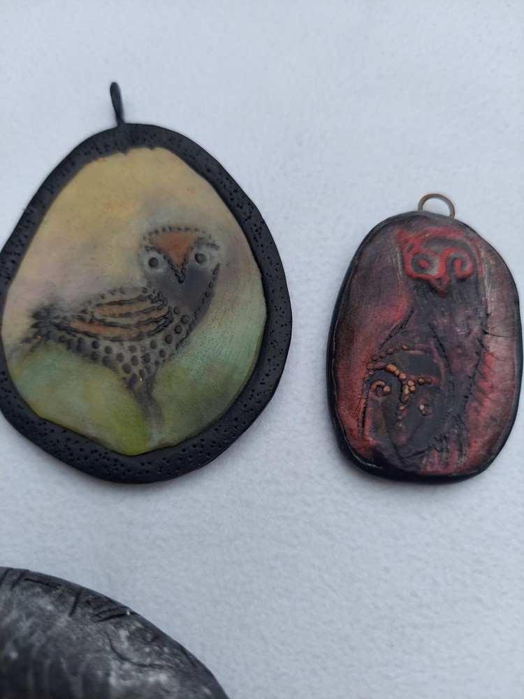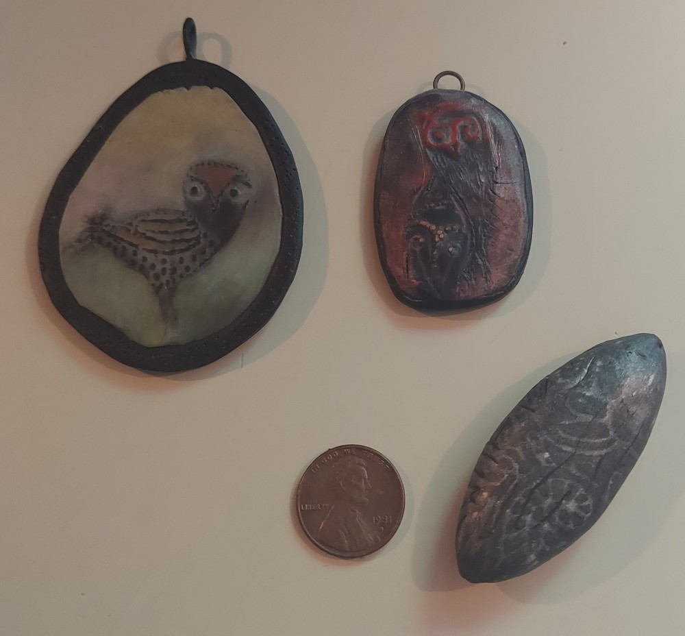 **PLEASE READ BEFORE BIDDING** You must have at least 25 positive feedback as well as a verified delivery address to bid on my auctions or do BIN. Any bids from new accounts will be canceled. U.S. bidders only please. Thank you for your understanding! In another year or so I will be retired from Corporate America and living my best life as a jewelry artist. Unfortunately I have some financial fine-tuning to do in order to make this happen, and that's where YOU come in. I drive a 1999 Jeep and have a 15-year-old cat: please. You do the math. I have made a hard decision to let go some of my enormous bead/jewelry making collection. These items are all art-to-wear focals from internationally known artist Claire Maunsell. Her art has shown up in a ton of books, and for good reason. She is known for her surface techniques, you can even take classes of hers, as I have. These pieces are all in perfect handmade condition. SO much prettier in person. It is so hard to find her work, I was lucky to get these. Two primative style owl oval pendants and one silver/grey/purple pod of mystery The larger owl is over 2", the smaller is under 2". Penny for size aprx The longer you look at these beads, the more interesting they become, like all of Claire's work Polymer clay, professionally finished museum quality Truly art to wear, you'll get a lot of attention when you wear these! Loose bead/focals to use in your jewelry creations, as shown. None are heavy Over the past 20 years I've amassed quite a collection of oddities, art-to-wear and just generally a whole lot of coolness. Some of these items have hung out with me a long time, and now it's time for them to move on to their new "people" **THE SEMI-LEGAL BORING STUFF** Payment is required within 48 hours of winning auction or BIN via PayPal. You must have a verified PayPal delivery address to bid on this auction. I promise to ship within 48 hours of receiving payment. By bidding or using BIN you are agreeing to buy this item, please do not bid if you do not intend to purchase. No returns accepted UNLESS I have grossly misrepresented the item, so please bid mindfully. Flat rate shipping for this item is $5, and I will pay any remaining shipping/insurance for U.S. bidders only.