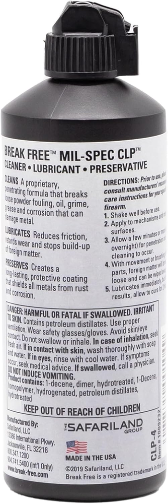 Cleans firing residue and other contaminants from the bore, moving parts and exterior of firearms while simultaneously reducing friction and protecting from corrosion Reduces metal-to-metal wear by protecting treated surfaces with an advanced boundary film Protects metals with special rust inhibitors Does not deteriorate under high temperatures and extreme pressure - other brands may contain wax-based materials that will degrade and solidify into a gummy residue The gold standard formula for the one step lubricating and protectant firearm solution Break Free CLP (MIL-SPEC 63460F Type-A) oil is more than just barrel cleaner. Trusted by agencies around the world, it was the first to pass MIL-SPEC 63460. CLP (cleaner, lubricant and preservative) cleans burnt powder residue and other fouling materials from the gun’s bore, moving parts, and exterior. The Break Free gun cleaner formula also reduces friction and protects against corrosion. CLP will not break down under extreme temperatures or pressure and is made from the highest-quality synthetic oils. For an all-in-one gun cleaner solution to service and preserve your firearm, use Break Free CLP.