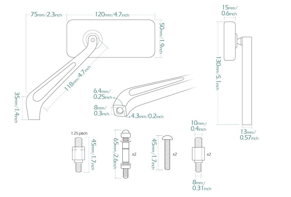 "I have ordered many different mirrors and these are the most amazing quality, price, and look. I don't know why anyone would waste their money on anything else out there. They are built like a tank, stay exactly where you last positioned them, and the tint definitely helps with the headlight glare from other cars. I would buy these and suggest them to others any time." Magazi Black rectangular mirrors motorcycle sportster bobber cruiser street naked road bike KiWAV WARNING: Colors may vary depending on monitor profiles and printer settings. Video We have clear mini videos which shows more details and helps to visualize your modification before actually having it on hands. Your browser doesn't support HTML5 video. Download the video . Measurement Please must check the measurement before making final decision. Please allow measuring deviation due to manual measurement. Item size measurement graph Specification SKU: 100102018260003 Features Another choice. From the stock mirrors. Mirrors are compatible for Harley Davidson underbar, no flip kit required. (Not for every Harley though, please check your rear view angle to decide.) The mirror plate and stem are constructed very well with CNC machined 6061 aircraft aluminum. About half the size of the OEM mirror. The simple & basic design makes your bike a little bit fresher as you can see. Always look good from any direction. Sleek and neat, up or down. Material CNC milled aluminum Shape Square Glass Anti-glare blue tinted convex lens Weight n.w.: 400 g / 0.9 lbs (pair), g.w.: 780 g / 1.7 lbs (total package, packing inclusive) Color Black Adjustment Fairly adjustable Package A pair of mirrors (left hand / right hand), 8mm to 10mm standard thread adapter x 2 PCS, 8mm to 10mm reverse thread adapter x 1 PC, 5/16" thread adapter x 4 PCS Compatibility 10mm(1.25 pitch): Universal compatible for 10mm thread motorcycles. Compatible for Harley Davidson '21 later Revolution® Max engine-equipped models, Nightster, Pan America, etc. 5/16": Compatible for most Harley Davidson. (except XG street models). Compatible for BMW R18 series models. aprilia BMW BSA Buell DUCATI Harley Davidson Honda Husqvarna Hyosung Indian Kawasaki KTM KYMCO MOTO GUZZI MV Agusta Norton Suzuki Triumph Victory YAMAHA KiWAV, kiwavMirror, kiwavmotor, motorcycle, kiwavClassic, naked, mat, black, 10M, 5/16inch Because of the small dimensions of the mirror glass, this product must only be fitted for racing or show purposes. How do I know if these mirrors fit my bike? If you're not sure, there are a few tips for you. Q: How do I know the size of my mirror thread? Please remove your current stock mirror and measure the diameter of the bolt. Q: How do I know the mirror thread pitch of my bike? Most big bike mirror thread is 1.25mm pitch, there are certain BMW big bikes mirror thread is 1.5mm pitch. Here's how you could measure: Use a vernier caliper. Find a screw that you're sure is 1.25mm pitch. Try to compare the mirror thread of the two. If it fits, it will look like this. Rule of Thumb Most big bike mirrors have 10mm standard/clockwise thread. Some Yamaha/Ducati, however, have a reversed/anti-clockwise thread and a standard/clockwise thread. Reverse thread mostly found on the right hand side mirror (view from the bike seat). These 5/16" bolts are for Harley-Davidson only. 8mm are for most scooters' mirrors. Some Yamaha scooters have a reversed/anti-clockwise thread and a standard/clockwise thread. Reverse thread mostly found on the right hand side mirror (view from the bike seat). Check the bolt area of your bike, and the bottom of our mirror stem to see if they fit. Check with your motorcycle dealer, motorcycle forum or Google for the correct mirror thread. We Recommend About "Every ride has its own personality, its own visual identity." With this in mind, Magazi has gone the extra mile to bring cosmetic individuality to its product proposition. An extremely dynamic designer , producer and supplier of mirrors for all type of motorcycles , Magazi's dedicated team of professionals has managed to strengthen and consolidate a brand that for many , is synonymous with flexibility and competitiveness. Magazi's efforts to bring is quality brand to a market that is highly competitive has depended hugely on its ability to produce a range of cost-effecetvie mirrors that has superior design attributes. Payment & Shipment We accept the following forms of payment: PayPal, and credit or debit card through eBay. For E-check payment, shipment will be made until PayPal indicates payment clear. We appreciate immediate payment. If payment is not received within 4 days after auction ended, unpaid item ( UPI ) will be automatically turned on to get the final value fee back. 24 hours Shipment will be arranged within 24 * hours after payment cleared. *Taiwan business days only. Shipping to address We ship to the address provided at checkout to comply with eBay policy. *If you need to change the address, please cancel the order before it ships and place a new one with the correct address. Warehouses We have 3 warehouses, Taipei, Taiwan; United States; Australia. Signature upon delivery Most shipping services we use may require a signature upon delivery. If you have special delivery requests, please let us know BEFORE placing your order. While we do our best to accommodate these requests, final delivery procedures are ultimately determined by the carrier. Wrap & Protection All items will be carefully wrapped for best protection. Duty / Tax Buyer is responsible for import duty/ tax if applicable. Important Tax & Customs Information for EU & UK Buyers eBay collects VAT at checkout for orders under the respective thresholds ( €150 for the EU and £135 for the UK ). For orders above these thresholds, you will be responsible for paying import duties, VAT, customs fees, and any other applicable charges directly to your local customs office or courier upon delivery . France is an exception, where eBay collects VAT 