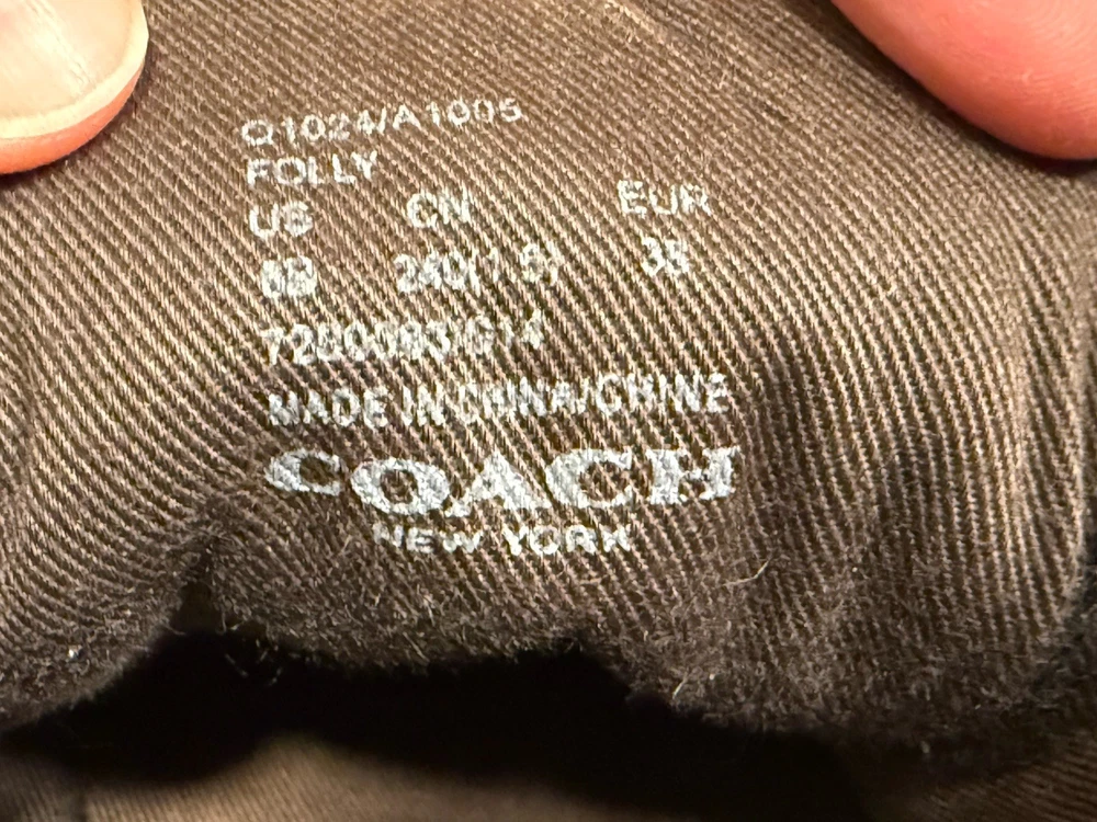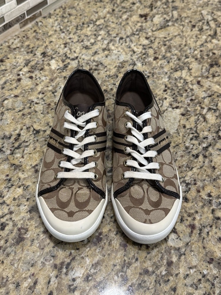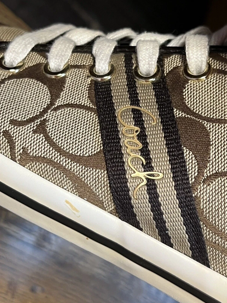 Step into effortless style with the COACH Women's Brown Monogram Signature Folly Lace-Up Sneakers. Crafted for the modern woman, these sneakers feature a chic fabric upper adorned with the iconic COACH logo, delivering a touch of designer elegance to your casual ensembles. The low-top silhouette, combined with a comfortable round toe and flat heel, ensures a smooth stride and all-day comfort. Designed with versatility in mind, these sneakers are suitable for a range of occasions, from a day at the office to a leisurely weekend stroll. The breathable fabric lining and foam insole provide a cozy fit, while the durable rubber outsole offers reliable traction. Whether you're navigating the city streets or exploring the classroom, these sneakers are a smart addition to your footwear collection. Pre-owned condition, minor signs of wear but clean! Heel logo worn due to age/wear. See pictures! Women's size 8. ***OC-boutique.and.more Specifics You Should Know*** Items ship quickly, same day / next day - all through USPS; unless otherwise notated in the listing. (Excluding Weekends & Holidays) I attempt to provide the most affordable shipping carrier available for the size & weight of the package. Shipping Materials Used: clean recycled boxes, new boxes, poly-mailers, bubble mailers, bubble wrap, packing peanuts or any combination of the above to ensure your items are secure and arrive in excellent condition. Please carefully review all pictures & descriptions, as that will clearly express the condition of each item. The listing will state if an item is USED, NEW, and any wear, damages or defects. Please check out my full list of available items and be sure to follow as listings are frequently added! All sales are FINAL. No returns accepted. Please reach out if you have any questions.