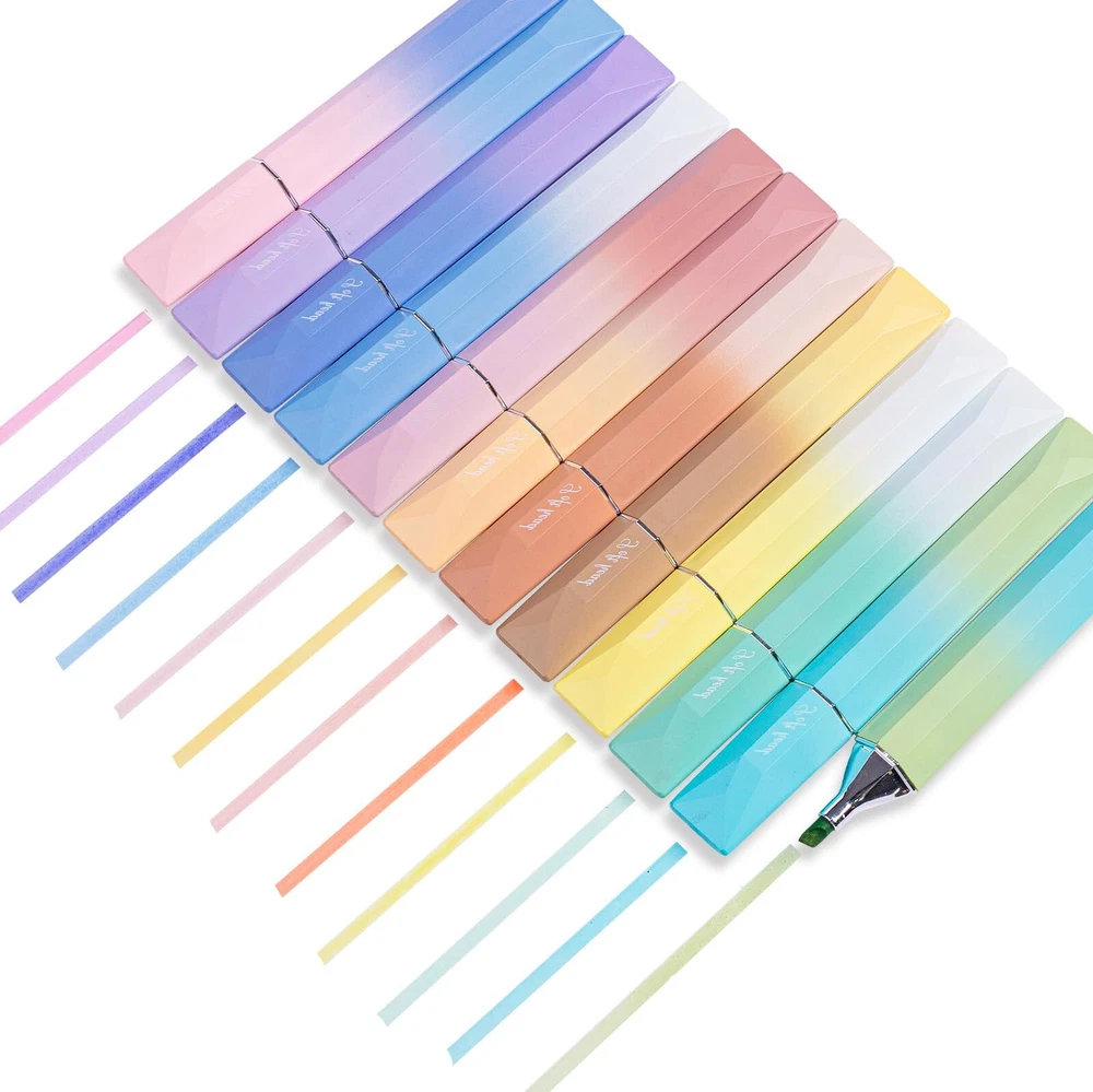 Mild Pastel Color- the highlighter pen set comes in 12 mild pastel ink colors that are perfect for highlighting,coloring for artwork, making notes,drawing, doodling,writing.The light colors are easy to read. 2.Smooth Writing: the highlighters assorted in 12 colors are with chisel tips,making it easy to write with and produce smooth lines.The set of highlighter marker pens are water based non-toxic ink. Attractive Design: the cute aesthetic highlighters for planners feature chic design and nice colors.Perfect gift pens for women,back to school supplies aesthetic,painting lovers, students , stationery addict and office supplies Mild Pastel Color- the highlighter pen set comes in 12 mild pastel ink colors that are perfect for highlighting,coloring for artwork, making notes,drawing, doodling,writing.The soft colors work great and are easy to read. Smooth Writing: the journaling highlighters assorted in 12 colors are with chisel tips,making it easy to write with and produce smooth lines.The pen set of highlighters markers for school are water based non-toxic ink. Easy to Write with: The unique design of pen barrel feels so great to write with. There are 3 color series with 12 colors to choose from for the writings. Nice colors, good mood to write. Pack-12pcs, 12 colors, ink color is same as the color of pen cap