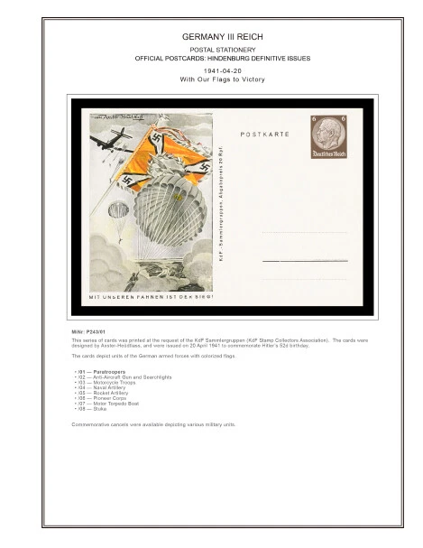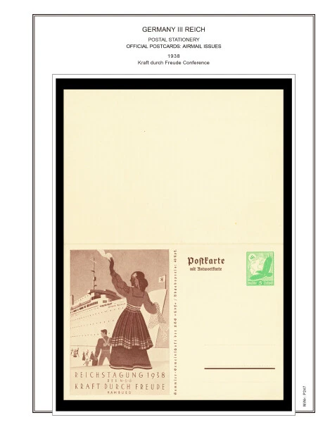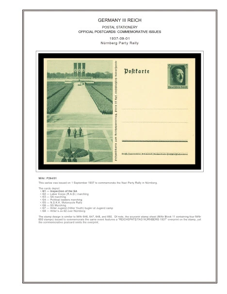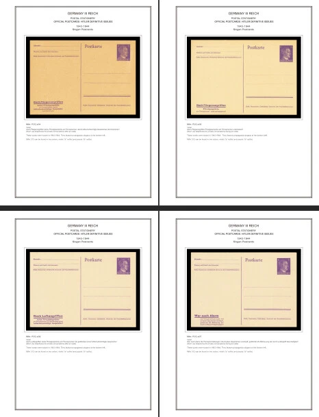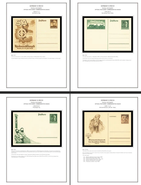 GERMANY III REICH STATIONERY: OFFICIAL POSTCARDS [ Postkarte Deutsches Reich | Vol.01: Hindenburg Definitives+Airmail Issues+Hitler Definitives & Vol. 02: Commemorative Issues ] 1933-1944 COLOR PRINTED STAMP ALBUM PAGES (169 pages) Full color printed pages f o r Germany III Reich official postcards 1933-1944 . The postcard illustrations are ordered chronologically and according to Michel catalogue. Top quality color stamp album pages printed on heavy stock 200 g/m 2 (75 lbs cover weight) acid-free couchet silky white paper. US letter size 8.5 x 11” . Technical Specifications: Country Germany (III Reich) Period 1933-1944 Print Full color Paper 200 g/m 2 (75 lbs) Nr. Pictures 169 (100% coverage) Package Weight 1/1.23 kg (2.20/2.71 lbs) NOTE: Info on postcard emissions, front /back illustrations and postmark pictures displayed (when/if available). Please note: These are full-color printed pages. They are NOT hingeless. For protection of both the pages and the postcards, we recommend using stamp mounts or similar instead of hinges. The pages are sent unpunched – this allows you to punch them as needed (for 2 or more ring binders). Black and white printing available on request. NO POSTCARDS INCLUDED. INTERNATIONAL STANDARD SHIPPING [Contact us first if you desire registered shipping or for shipping rates within Europe] [Stampextras won´t be responsible for losses under international standard shipping ] GERMANY III REICH OFFICIAL POSTCARDS 1933-1944
