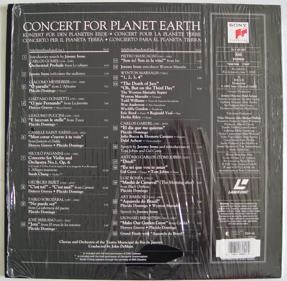 Laserdisc Edition CONCERT FOR PLANET EARTH This is a LaserDisc *** This is Not a DVD *** A Laserdisc needs to be played on a Laserdisc player *** It will not play on a DVD player Recorded Live in Rio de Janeiro , June 7 , 1992 CONCERT FOR PLANET EARTH Laserdisc Edition Starring : PLACIDO DOMINGO - WYNTON MARSALIS - SARAH CHANG - GAL COSTA - DENYCE GRAVES - ANTONIO CARLOS JOBIM Chorus & Orchestra of the Municipal Theatre of Rio De Janeiro , Conducted by John DeMain - Recorded Live in Rio de Janeiro , June 7 , 1992 ................................................................................................ Laserdisc in NTSC format , Extended Play , Stereo Sound , Total Running Time 114 Minutes , (C) 1992 Sony Classical . With this Laserdisc is also included a 4-page inserts with program traslation in 5 different languages . Laserdisc is in Excellent Condition - Tested and plays well Gatefold Jacket is also Excellent , still in original shrink wrap , minor shelf / handling wear only , Clean , NO tears , holes or cuts Buyer pays for shipping costs Please see my other Ebay listings , I will combine shipping with other Laserdiscs I will be No Responsible for Damaged Items during Shipping , Please ask for Insurance if Interested !! Thank You for looking