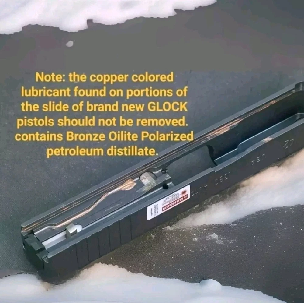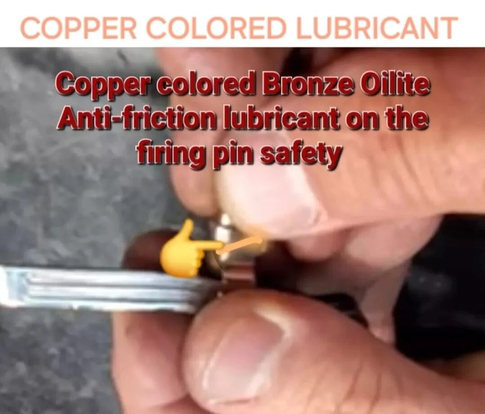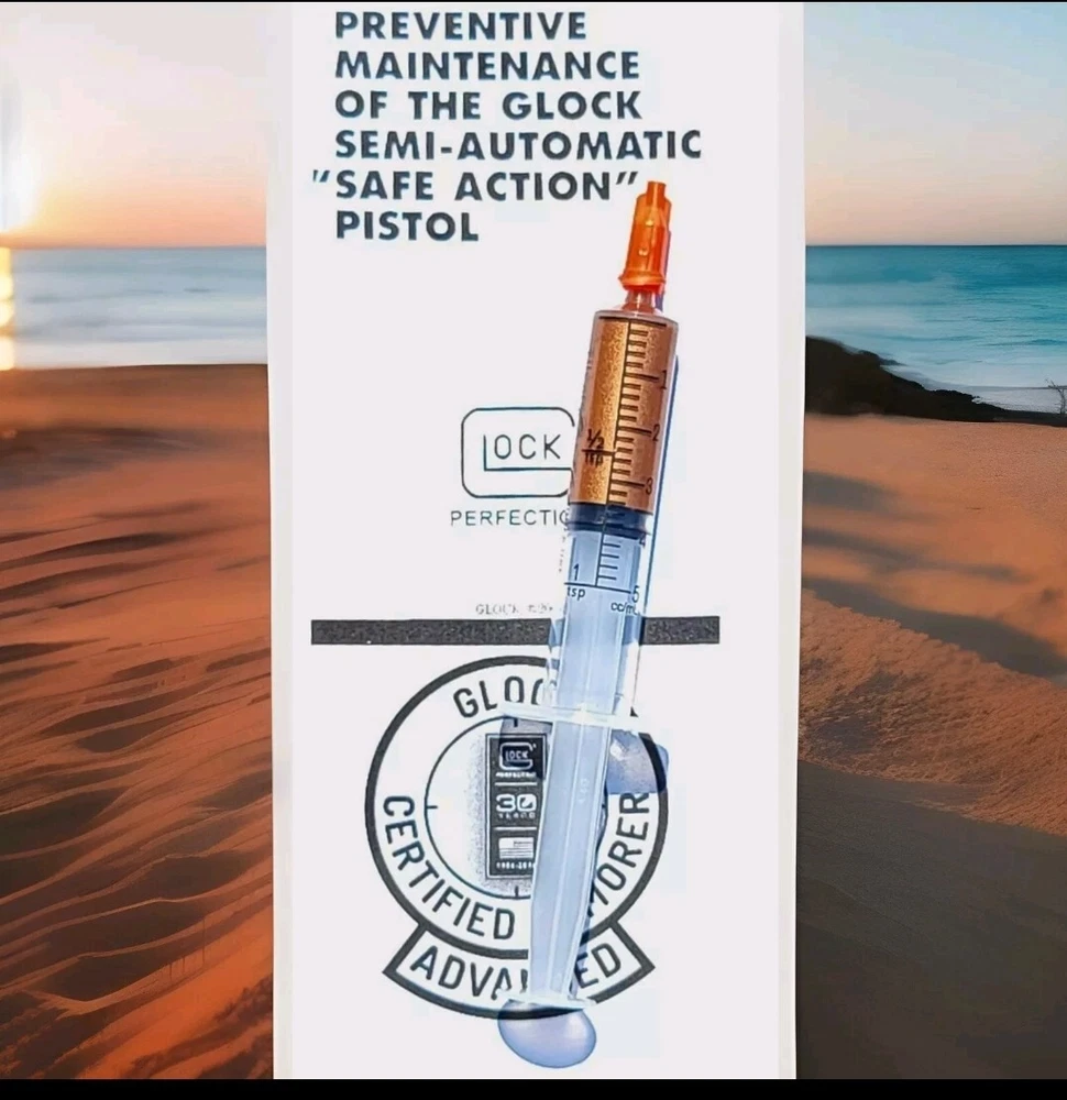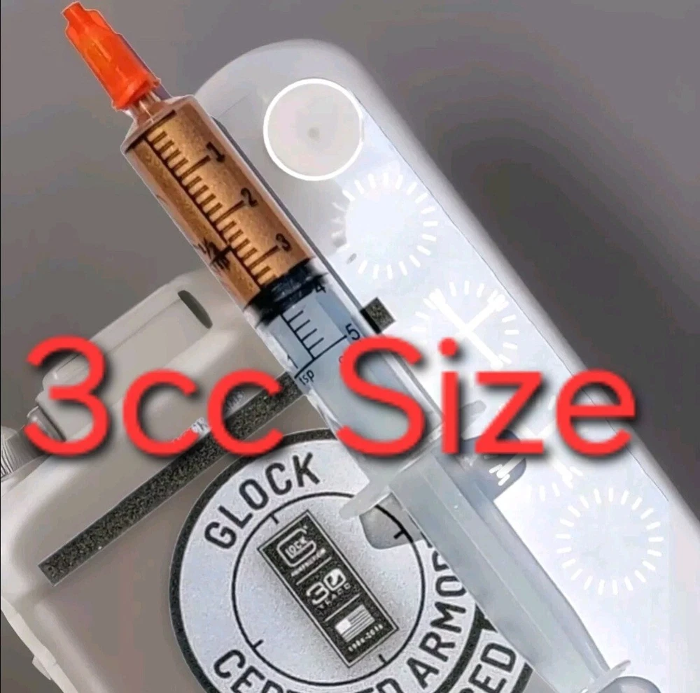 3cc/3ML SIZE The perfect gift for the one who has everything GLOCK. Sure will be a surprise! "The copper colored lubricant found on portions of the slide and trigger connector should not be removed...After cleaning...Apply the copper colored lubricant to portions of the frame, slide and trigger connector..."-Glock Inc 2003 This copper colored lubricant is the perfect addition to your gun cleaning supplies. With a 3ml "grease" formula, it has been proven to provide excellent performance and protection against wear and tear. The oil brush set includes two items and is specifically designed for lubrication purposes. This vintage item is a must-have for any gun enthusiast and is ideal for those who enjoy hunting and gun smithing. The main purpose of this lubricant is to ensure that your firearm operates smoothly and efficiently. Add this to your cleaning supplies today and experience the benefits of proven performance. Enhance the performance of your GLOCK pistol with this high-performance lubricant. The Bronze Oilite brand offers a saltwaterproof and heavy-duty lubricant that is perfect for all caliber GLOCK pistols. The 3.0ml unit comes with a syringe for easy application. This lubricant is designed to ensure smooth operation and prevent wear and tear on your GLOCK pistol. It is made of high-quality bronze copper material and contains a copper-colored lubricant that is perfect for enhancing the aesthetic appeal of your pistol. The item weighs only 3.0ml and is manufactured in the United States. Get your hands on this premium quality lubricant and take the first step towards maintaining the optimal performance of your GLOCK pistol. GLOCK The spirit of the age is to make you forget. To forget the genius of Gaston Glock. To not remember the copper colored lubricant found on portions on the inside of new glock pistols. To not remember the instructions of "Should Not Be Removed " To not remember the Glock endurance test of one million rounds fired from a single pistol. COPPER COLORED LUBRICANT The same anti-friction, anti-seize, high temperature, water resistant, no run, copper grease found in a brand new Glock off the assembly line. When you buy a new Glock, you are NOT supposed to clean off the Bronze Oilite copper grease. You are supposed to let it protect against wear and friction over time by itself. This special Bronze Oilite grease serves two important purposes. First, it works as an anti-friction agent as you break in your gun. Bronze Copper is a much softer metal than steel and the polarized petroleum distillate grease is a lot thicker than basic gun grease, these two factors give more protection than standard gun grease for parts with steel on steel contact that take lots of abuse. The second reason Glock applies this is because when they make a new gun, there is no way to know how long it may sit on the shelf before it is sold. This Bronze Oilite anti-seize is ideal for long-term storage. Will not run like typical gun grease or gun oil. This anti-corrosion grease can also be used in place of regular gun grease to protect your springs and magazine spring to keep moisture from rusting them up. Bronze Oilite lubrication can also be used in other firearms as well. Just a dab of this at a time because a little of this copper colored lubricant goes a long way. Place a small drop on the rails and some other metal on metal contact areas or anywhere else you would use traditional gun grease. The spirit of the age is to forget the Glock endurance test of 1 million rounds fired from a single Glock 17 with only this proven superior copper colored lubricant inside. Without breaking a single part and only replacing worn magazines. Unmatched performance from a single pistol, with credit going to the copper colored lubrication that no other wet oil or gun grease can provide. ◇ Glock endurance tested 1 million rounds fired from a single pistol* Anti-friction...IMPORTANT INSTRUCTIONS: DO NOT DILUTE. The Bronze Oilite ball bearings are designed to attach to the pores of the steel and rotate freely in the Polarized petroleum distillates. ◇*08-02-2010 | 12:44 PM SJgunguy24 *The old National Shooting Club in Santa Clara had a G 17 that had 1,000,000 rounds. The Glock factory purchased back that pistol for testing. My 17 is close to 50K