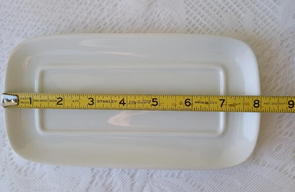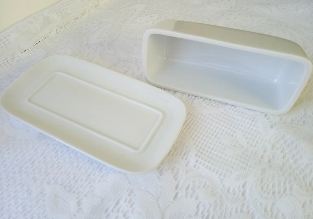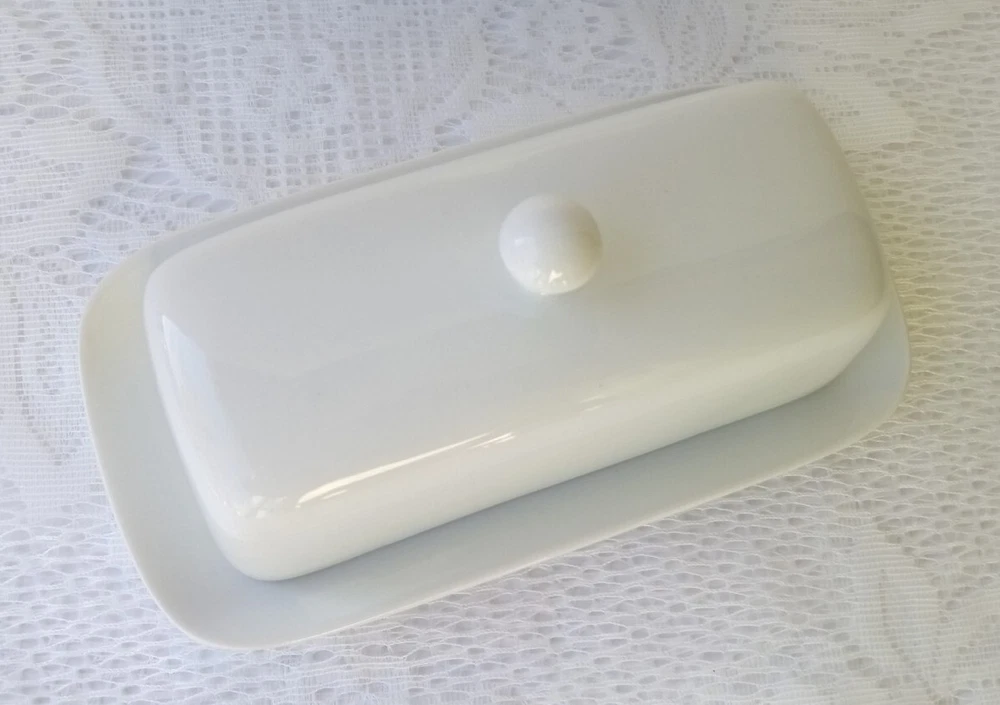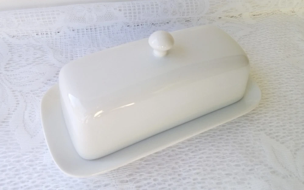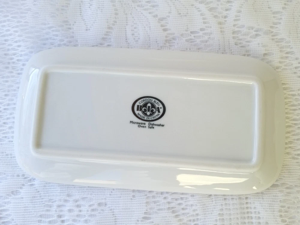 CORDON BLEU White Ceramic Butter Dish with Lid Measures approximately 8" length, 4 1/4" wide and about 3 1/2" tall with lid Overall very nice condition with no chips or cracks detected. There is a slight discoloration spot found on the platter edge (please see last picture). Packed with Care and Ready to Ship