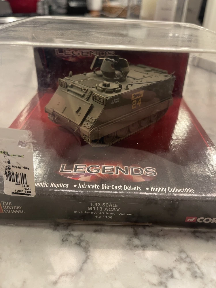 Delve into the world of military memorabilia with the CORGI/The History Channel Legends 1:43 M113 ACAV. Crafted by Corgi, this die-cast model is a must-have for enthusiasts of historic military vehicles. The M113 ACAV model replicates the iconic tank in stunning detail, making it a great addition to any collection. As a limited edition piece, it comes in its original unopened box, ensuring it remains a pristine collectible. The 1:43 scale captures the intricate design and functionality of the real-life tank, providing both a visual and educational experience. Ideal for collectors and history buffs alike, this model is a tribute to the engineering marvels of military history. Minor crushing damage to the packaging, does not affect the model.