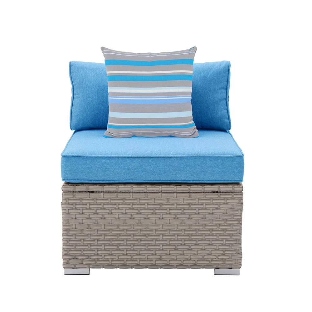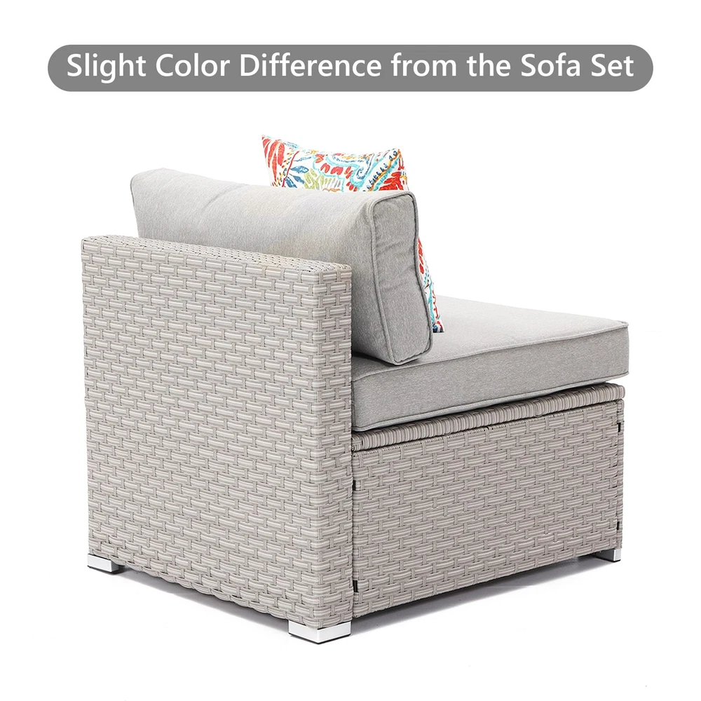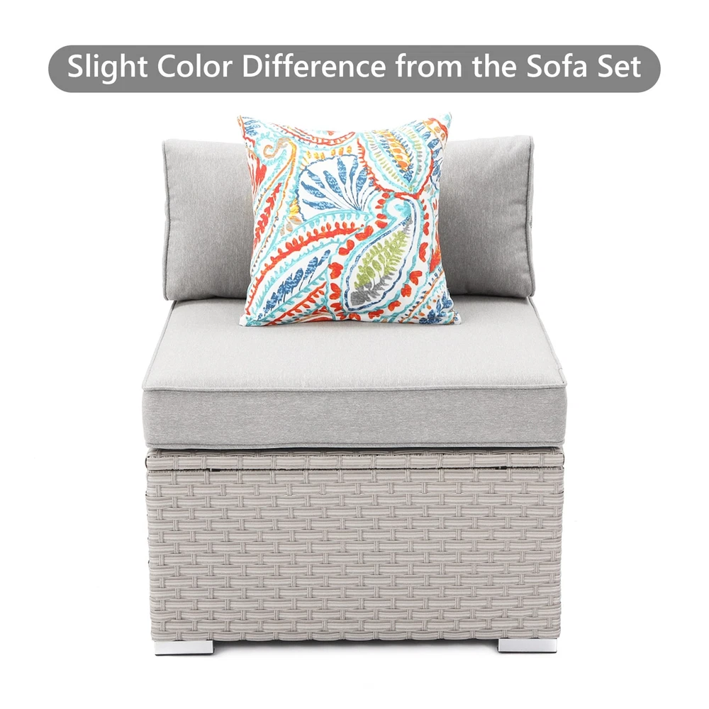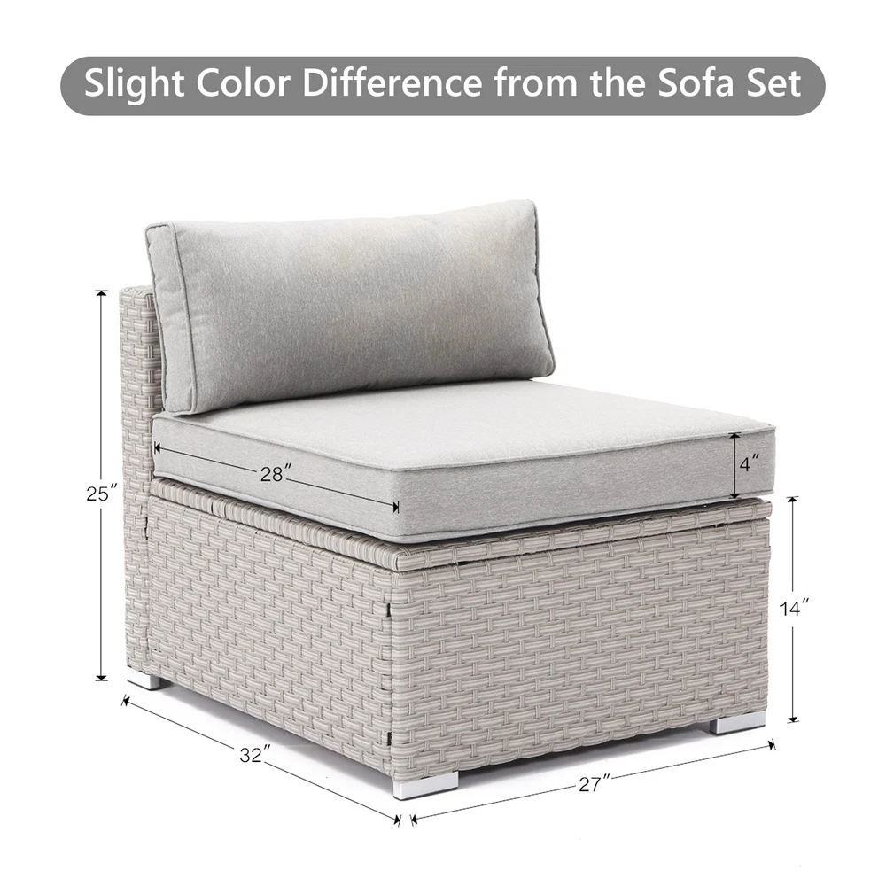 Create an inviting and comfortable outdoor space with the COSIEST Outdoor Wicker Patio Sectional Armless Chair. Made with hand-woven PE resin wicker and weather-resistant cushions, this chair is built to last on a sturdy powder-coated steel frame. Whether used on its own or combined with other chairs to form a sectional sofa, this chair is sure to impress.Features: Hand-woven PE resin wicker and powder-coated steel frame for durability Weather-resistant, high-density foam seat and back cushions for comfort Solution-dyed poly-fiber fabric cushion covers with hook and loop fastening strips for easy maintenance Breathable, all-weather design ensures lasting use Includes 2 furniture clips for connecting multiple chairs 350-pound weight capacity for added support Assembly Free Shipping Over $49.99* Details COSIEST PE Wicker Outdoor Armless Chair with Pillow Product Description: Create an inviting and comfortable outdoor space with the COSIEST Outdoor Wicker Patio Sectional Armless Chair. Made with hand-woven PE resin wicker and weather-resistant cushions, this chair is built to last on a sturdy powder-coated steel frame. Whether used on its own or combined with other chairs to form a sectional sofa, this chair is sure to impress. Features: Hand-woven PE resin wicker and powder-coated steel frame for durability Weather-resistant, high-density foam seat and back cushions for comfort Solution-dyed poly-fiber fabric cushion covers with hook and loop fastening strips for easy maintenance Breathable, all-weather design ensures lasting use Includes 2 furniture clips for connecting multiple chairs 350-pound weight capacity for added support Assembly required NoteThis light gray armless sofa is a slightly mismatched color variant and is being sold as part of a clearance sale, so it cannot perfectly match the entire sofa set. If you don't mind the color difference, you may still consider purchasing it. However, if you have strict requirements for overall coordination, it is recommended to choose a style that matches the color of the other sofas. Measurements: 27 inches wide x 32 inches deep x 25 inches high